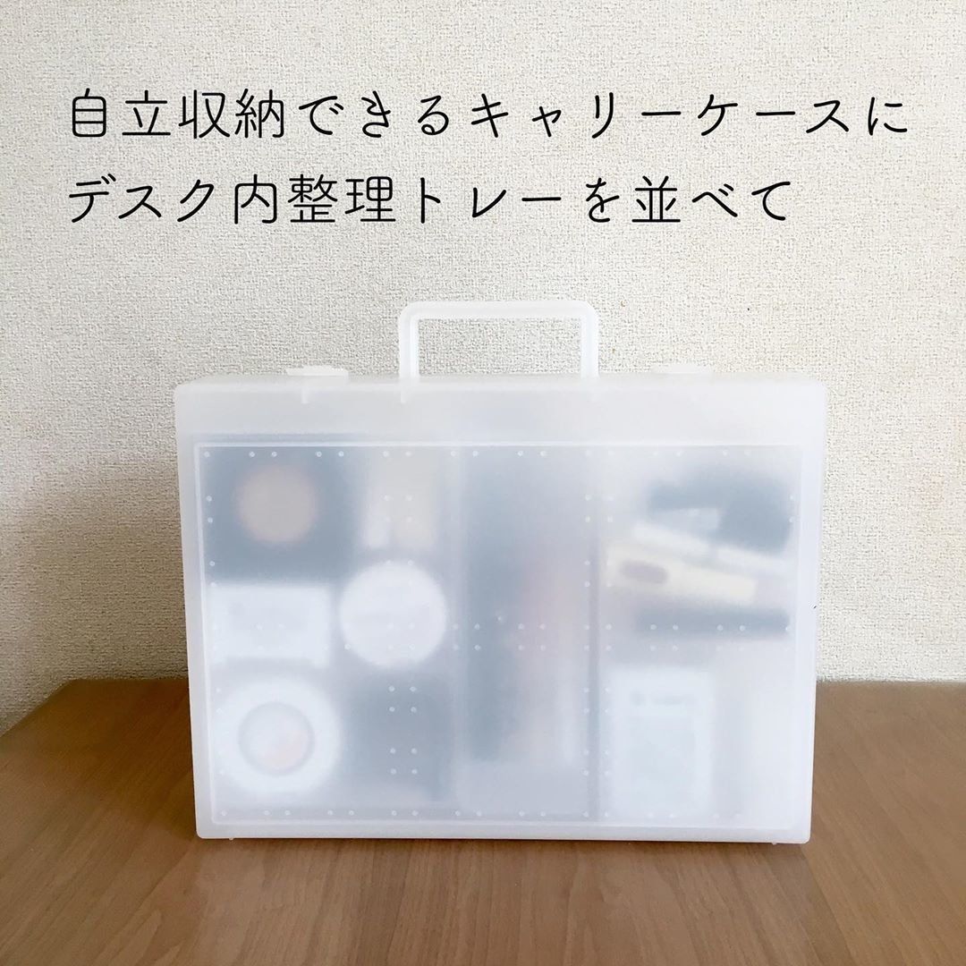 自立できる収納タイプのキャリーケースに、アイシャドウ1個とチーク2個、リップとそのほかのコスメ類を収納。デスク内整理トレーを並べて入れています。リップは多めでも、しっかりと収納できています。メイク用品はこのケースに入る分しか買わないと決めたmariruri.fp3さんでした。