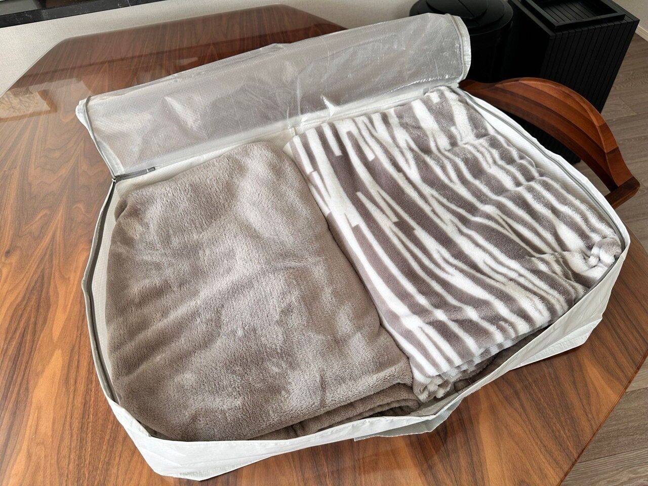 毛布2枚がちょうど収納できるサイズになっていて、羽毛布団ならシングルサイズ1枚収納できます。冬物の厚手のセーターなどを収納するのにもすごく便利な収納袋になっていますよ。しっかりと幅があるので、お子さんのお絵かき作品やちょっとした立体作品などを収納するのにもぴったりだと思います!
