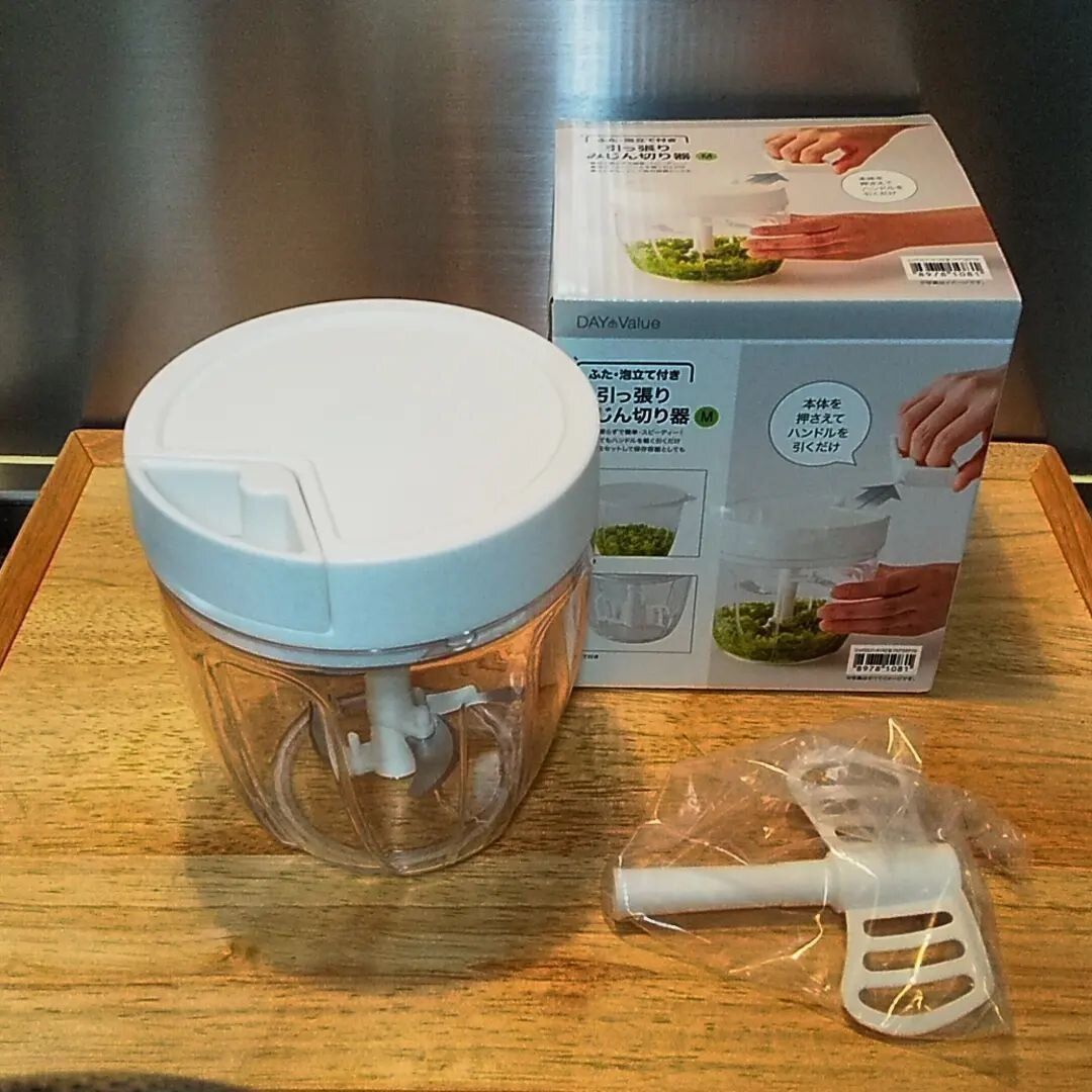 包丁いらずで、簡単にみじん切りができる「引っ張りみじん切り器2(Mサイズ ふた・泡立て付き)」。野菜を入れてハンドルを引くだけで、みじん切りができあがります。さらに、なかのパーツをかえると、泡だてやミキサーとしても使えるすぐれもの。フタをセットすれば、このまま冷蔵庫で保管することもできますよ。値段は、999円となっています。