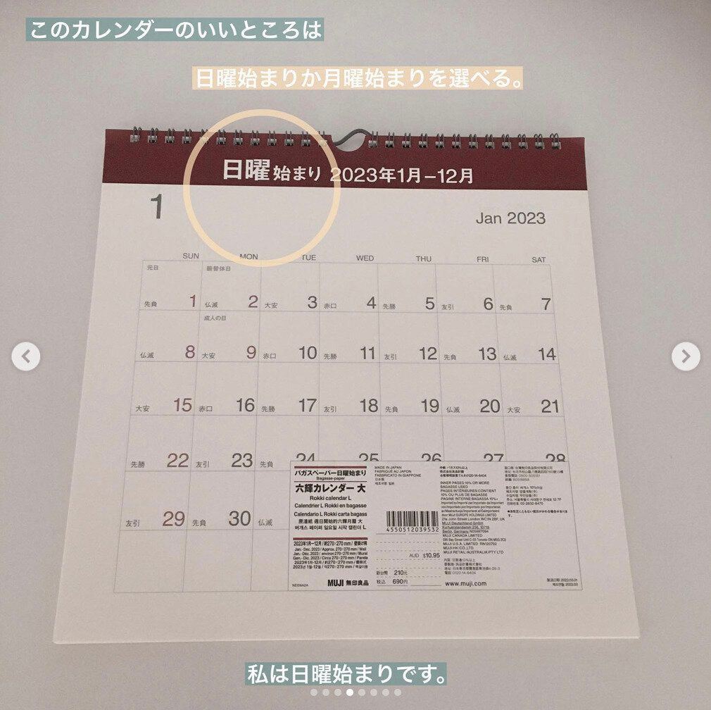無印良品ではたくさんの種類のカレンダーを扱っています。卓上用から壁掛け用、またサイズもさまざまです。それぞれのおうちに合うサイズが買えるのはもちろんのこと、さらにうれしいのが、日曜始まりと月曜始まりが選べること。人によって好みが違うので、選べるのはいいですよね。サトウキビを絞った後に出る繊維で作られた「バガスペーパー」でできていて、環境配慮されているところも、さすが無印です。