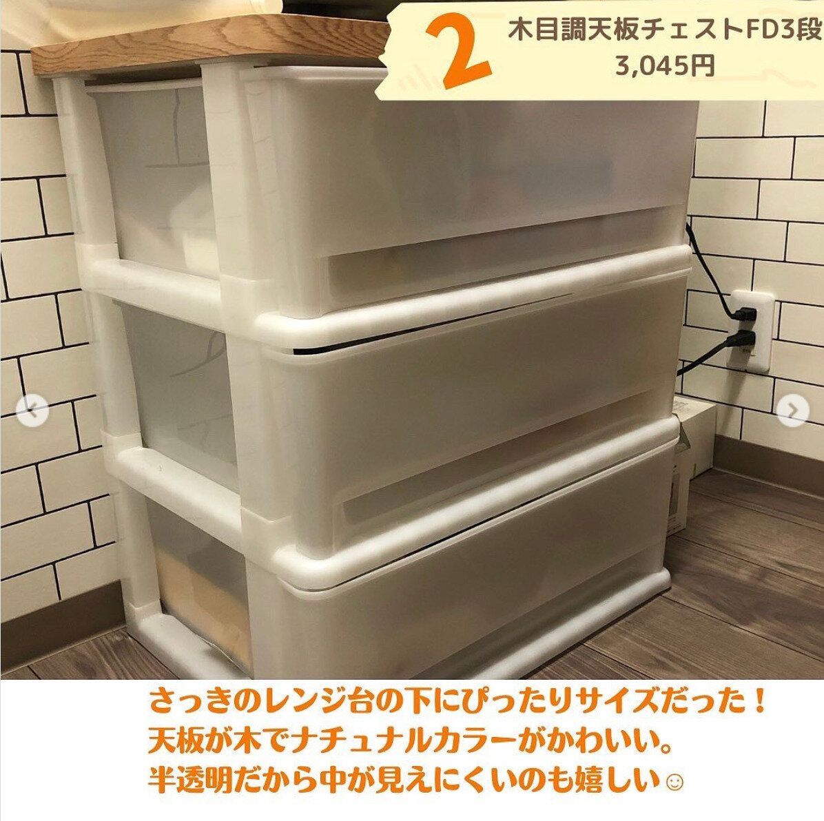 キッチンや脱衣所、クローゼットなどいろんな場所で活躍しそうな木目調天板チェストです。組み立てが簡単で、汚れを拭き取りやすいのも人気の秘密です。天板の下は3段の収納になっていて収納力は抜群!4段タイプ、5段タイプもあるので、使いたい場所と内容によって選んでみてくださいね。