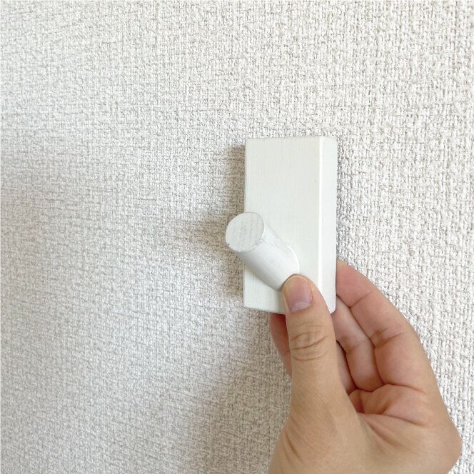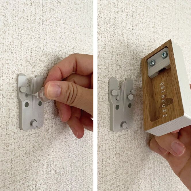 壁に専用フックを取りつけ、本体裏の受け部分を引っかければ完成です。