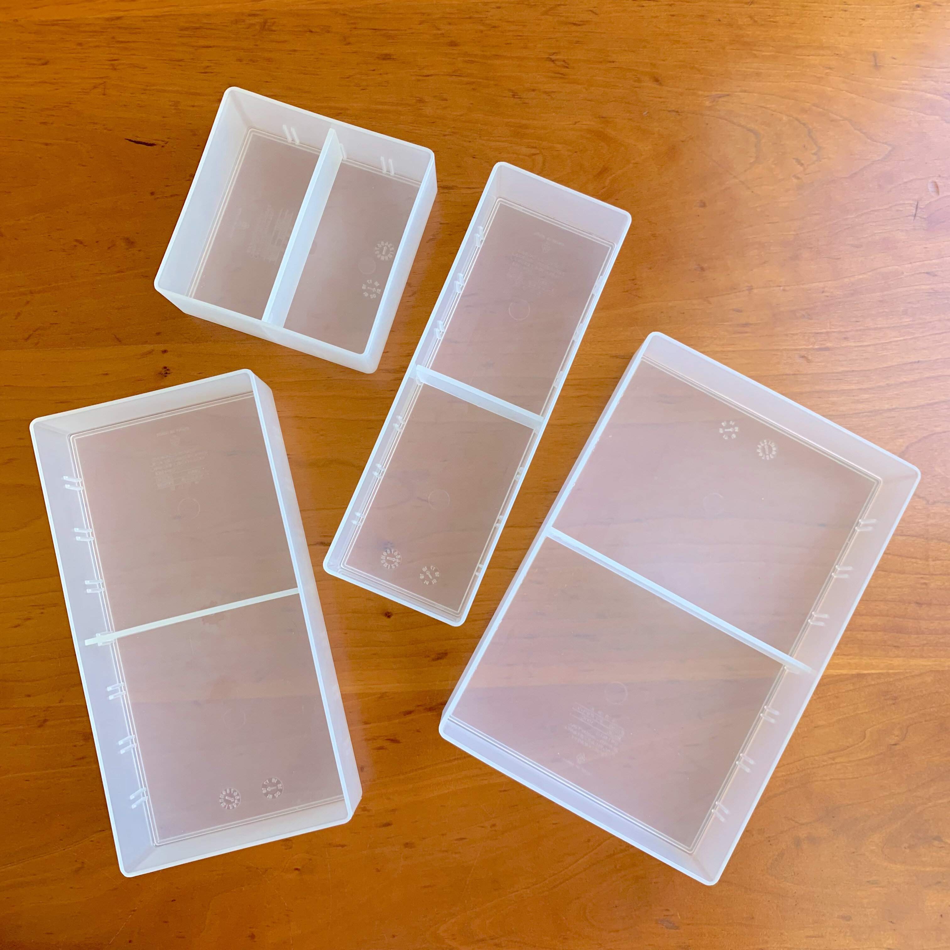 引き出しなど収納ケースの中を整理できるトレーです。サイズが4種類あるので、うまく組み合わせることでどんなケースにもすっきり収まります。