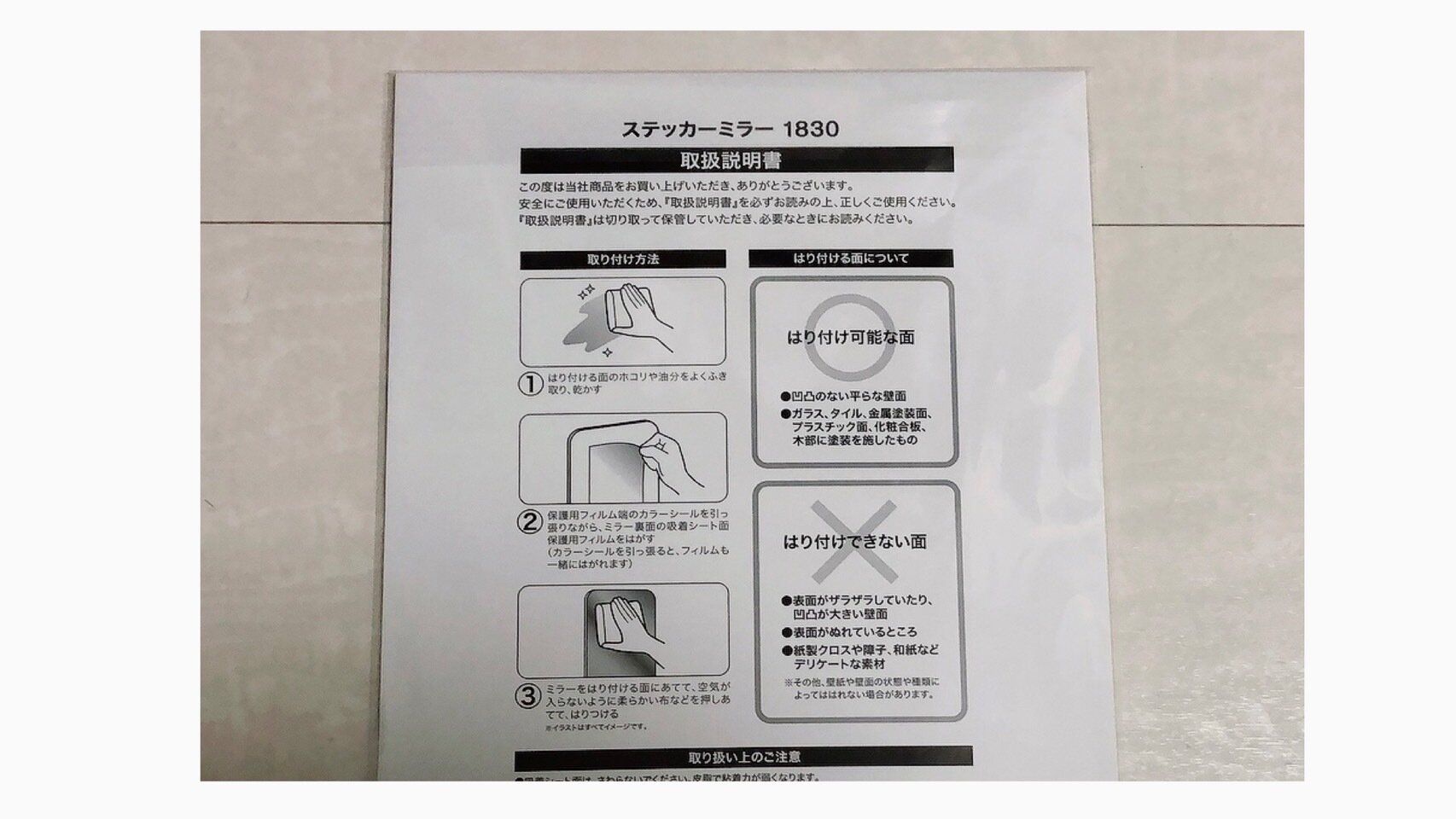 吸着シートの保護用フィルムをはずして、押し当てるだけ。吸着シートはべたべたしていなくて本当に張り付くの?と思いましたが、ミラー上から押し当てるとピタッと張り付きました。