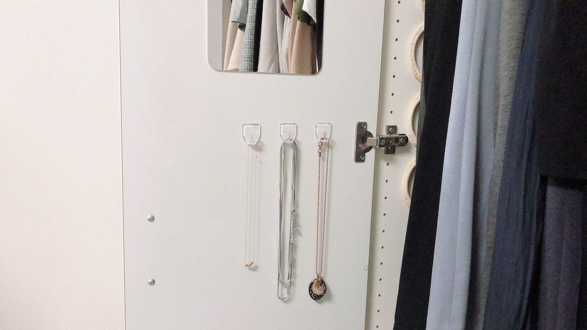朝の身支度はとにかく時間をかけられないですが、クローゼット扉裏にミラーやアクセサリー用フックをつけたことで、パッとコーディネートを確認できるようになりました。