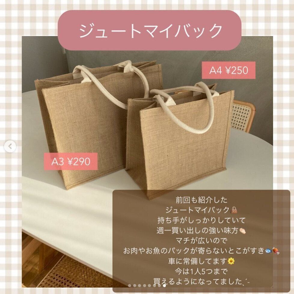次に紹介する商品は、プチプラでどのようなスタイルでも使いやすいと人気の「ジュートマイバッグ」です。