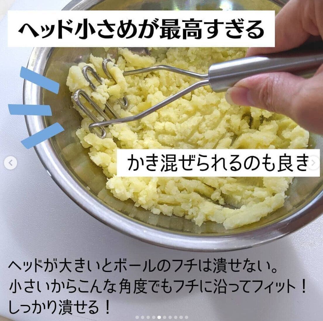 一般的なヘッドが大きいマッシャーとは違い、無印良品のものは小さいうえに特殊な形状のマッシャーのため、ボウルの隅まできれいに潰せるのがおすすめのポイントです。