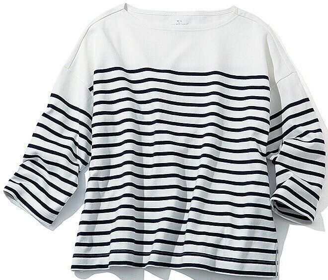 次に紹介する商品は、アラフォーでも着こなせる「ボートネック七分袖Tシャツ」です。ボーダーが最近似合わなくなってきた、と悩まれているかたにおすすめのTシャツです。
