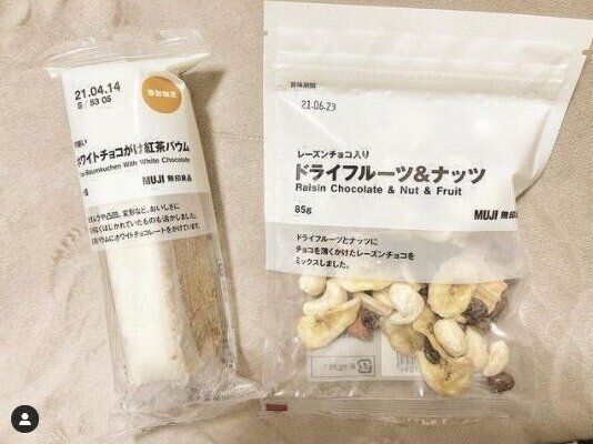 無印良品の定番のロングセラー商品で、中にはドライフフルーツとナッツ、そして薄くチョコがかかったレーズンチョコが入っています。