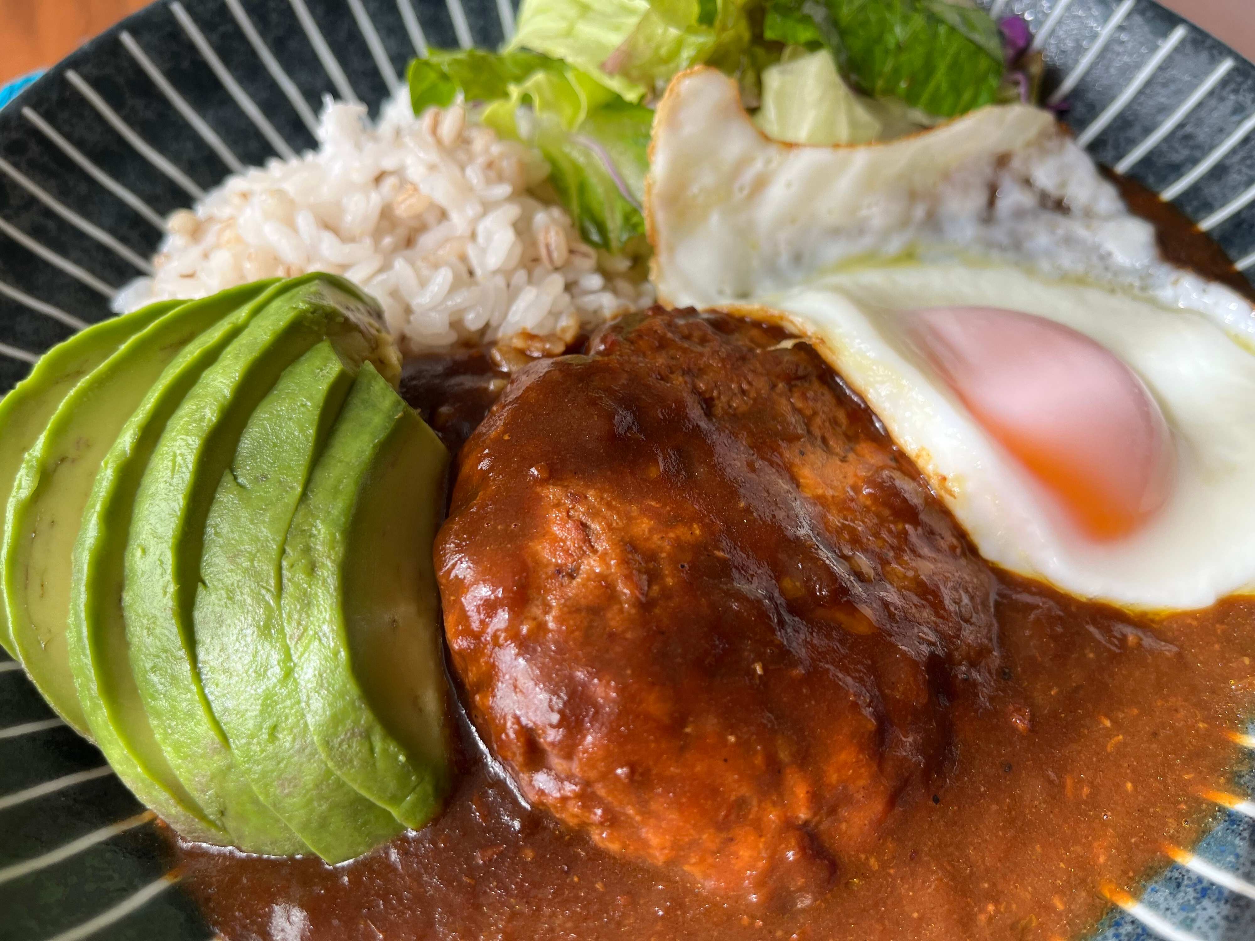 デミグラスベースということで、ロコモコ風にアボカドや目玉焼きを添えていただいてみます!