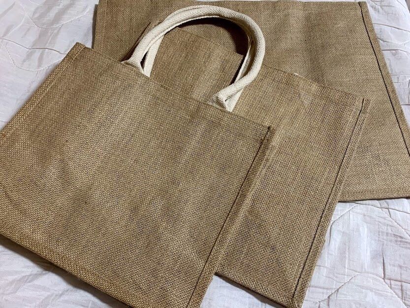他の素材のバッグに比べてしっかりしていて、自立できるジュートマイバッグ。