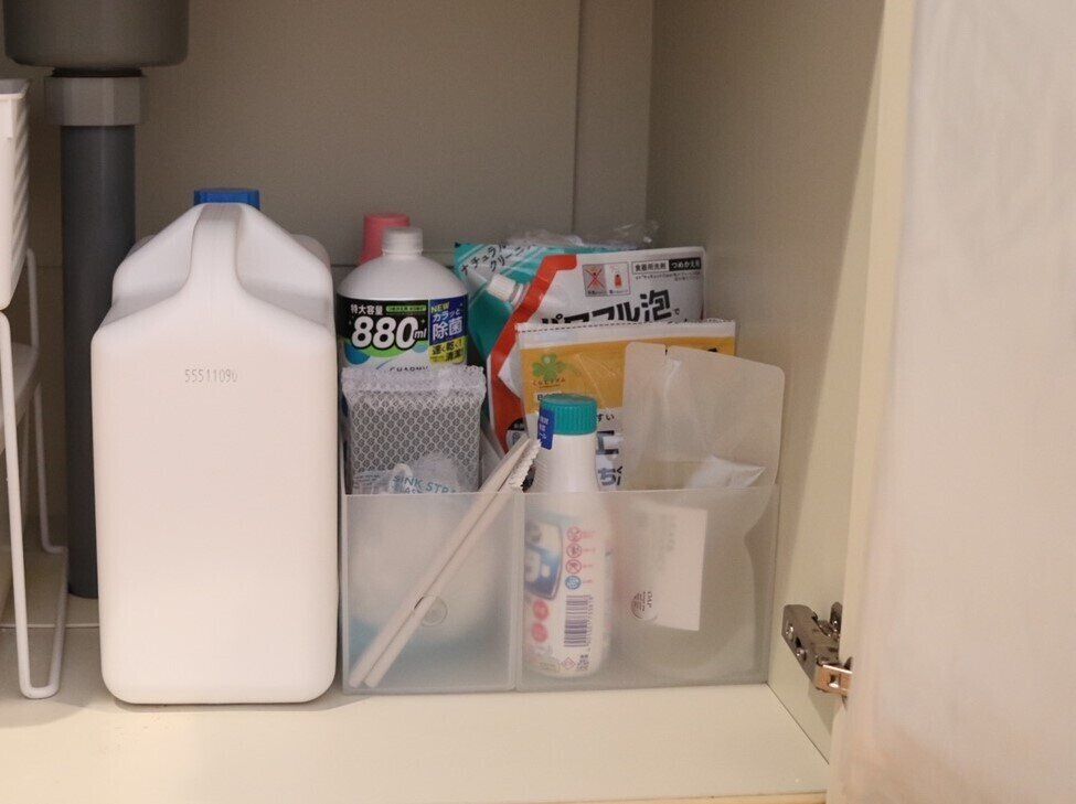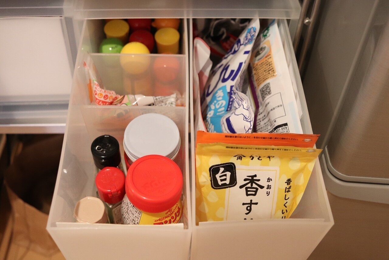 中に仕切りがあるのでモノの大きさ、種類に分けて整理しやすいかと思います。手前は使用頻度の高い調味料、使用頻度の低いスパイス系は奥に収納しております。ちなみにこちらのケースはクリアで透けるため厚紙を貼り、下着や調味料を隠して見えない工夫も。
