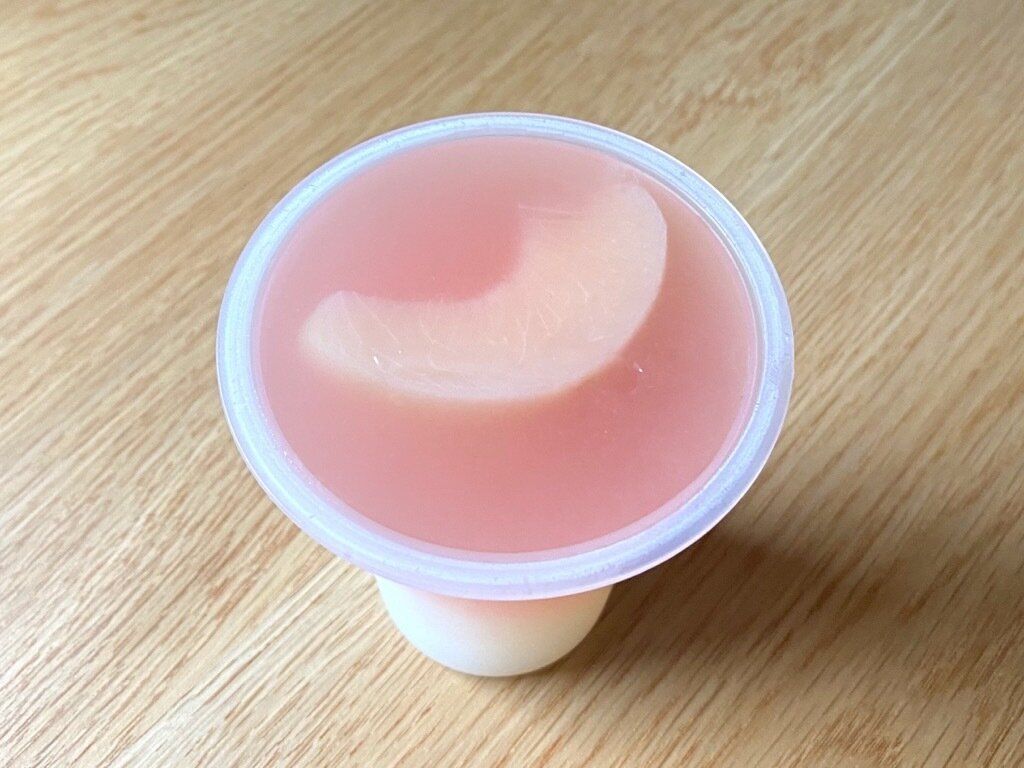 白桃果肉はシロップ漬けになっているので果実のようなジューシーさを楽しめます。桃ゼリーはしっかりと桃の味を感じ、舌で押しつぶせるくらいの柔らか食感。下層のヨーグルト味ゼリーはほんのり酸味があり、上層よりさらに柔らかくトロっとなめらか。2種の異なる食感がおもしろいゼリーです。