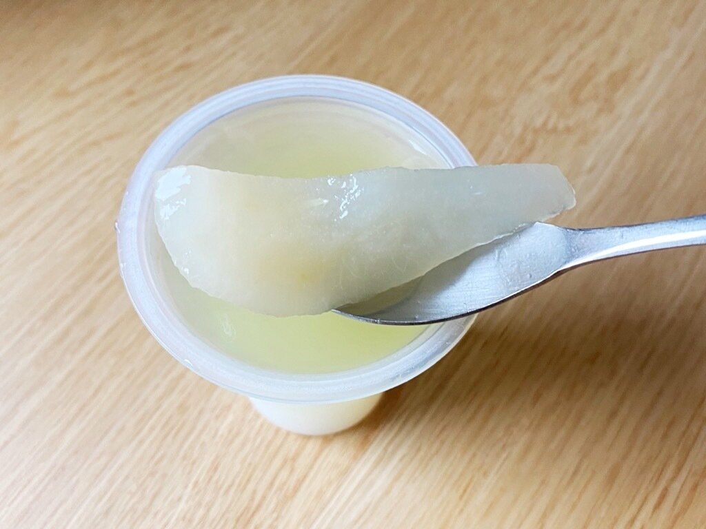 3つのなかで1番サッパリとした味わいの洋梨ゼリー。果肉はシロップ漬けになっていますが、洋梨の歯応えが少し残っています。ヨーグルト味ゼリーとも相性がよく、さわやかな味わいはこれからの暑い季節にピッタリです。