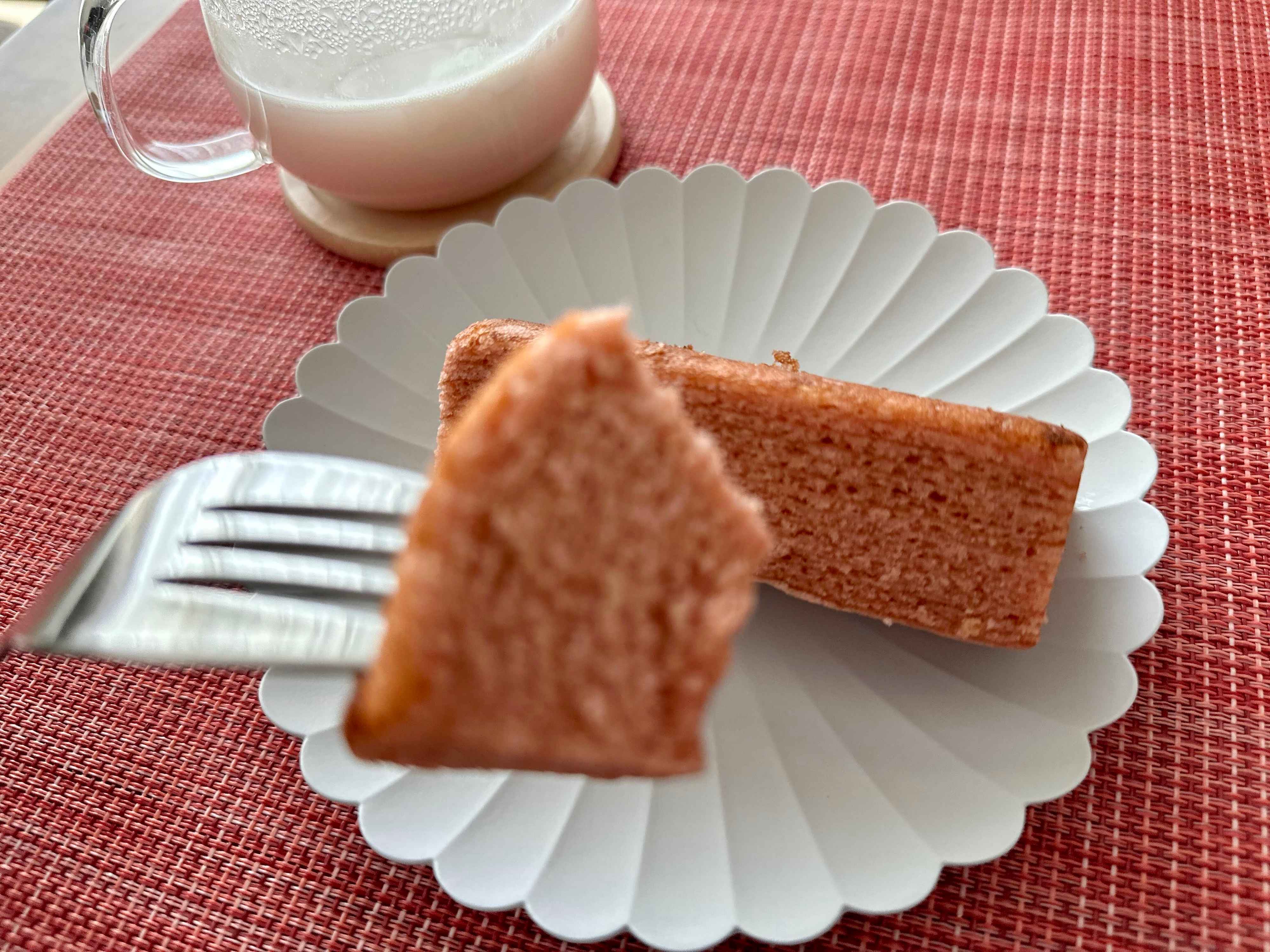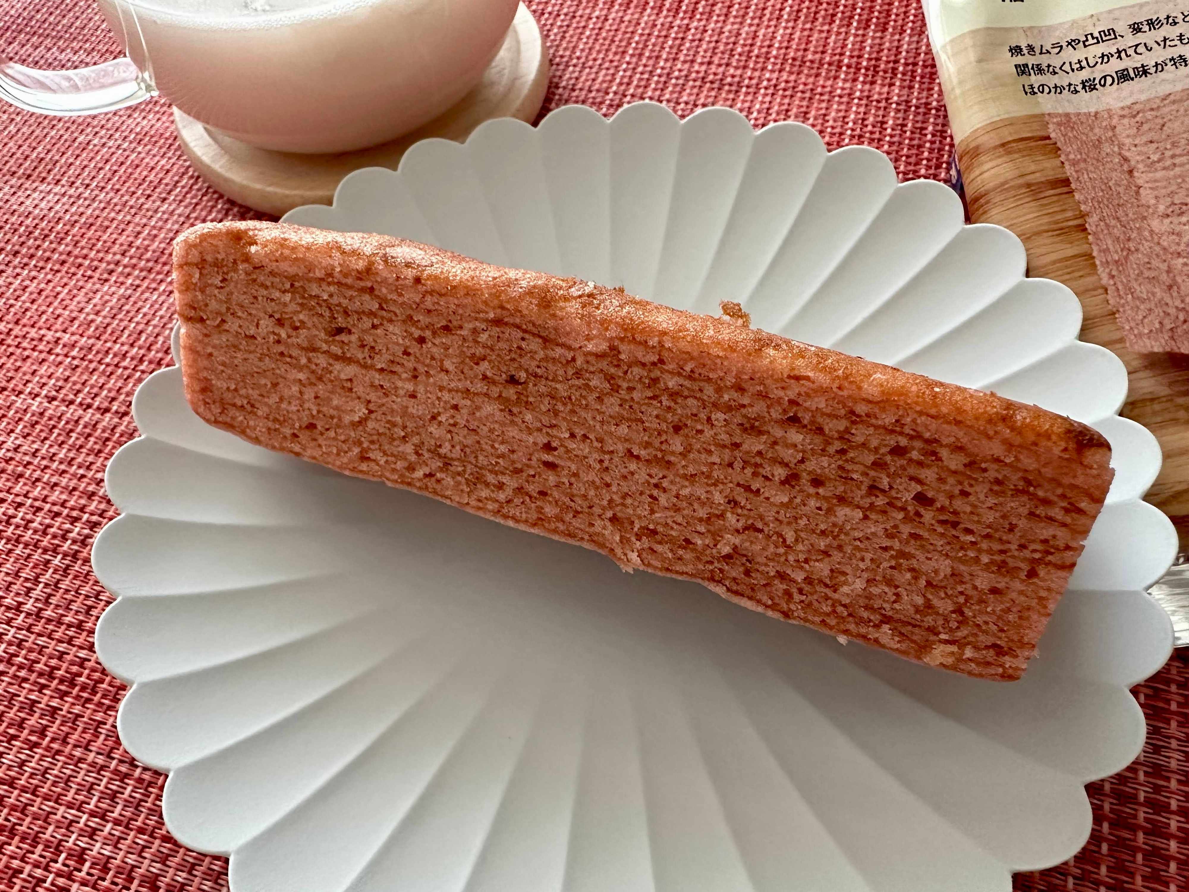 バウムクーヘンのあま〜い香りの奥に、桜の香りがふんわり。鮮やかなピンク色がかわいらしく、見た目からも春らしさを感じます。