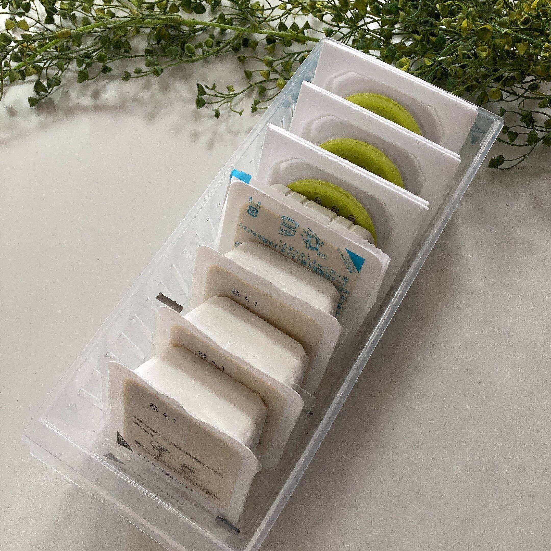 整理トレー大は納豆や豆腐などのパック類の収納におすすめです。