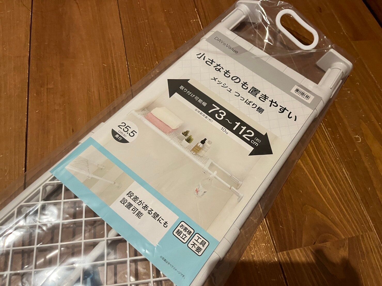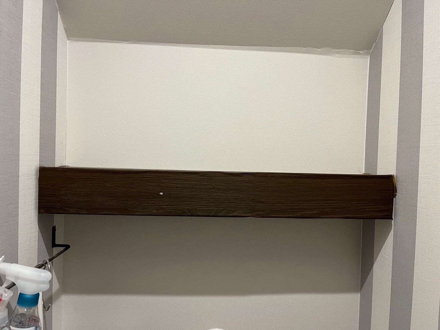 その後、100均で板と突っ張り棒、リメイクシートを買ってきてDIYしましたが強度がなく重いものが置けませんでした。