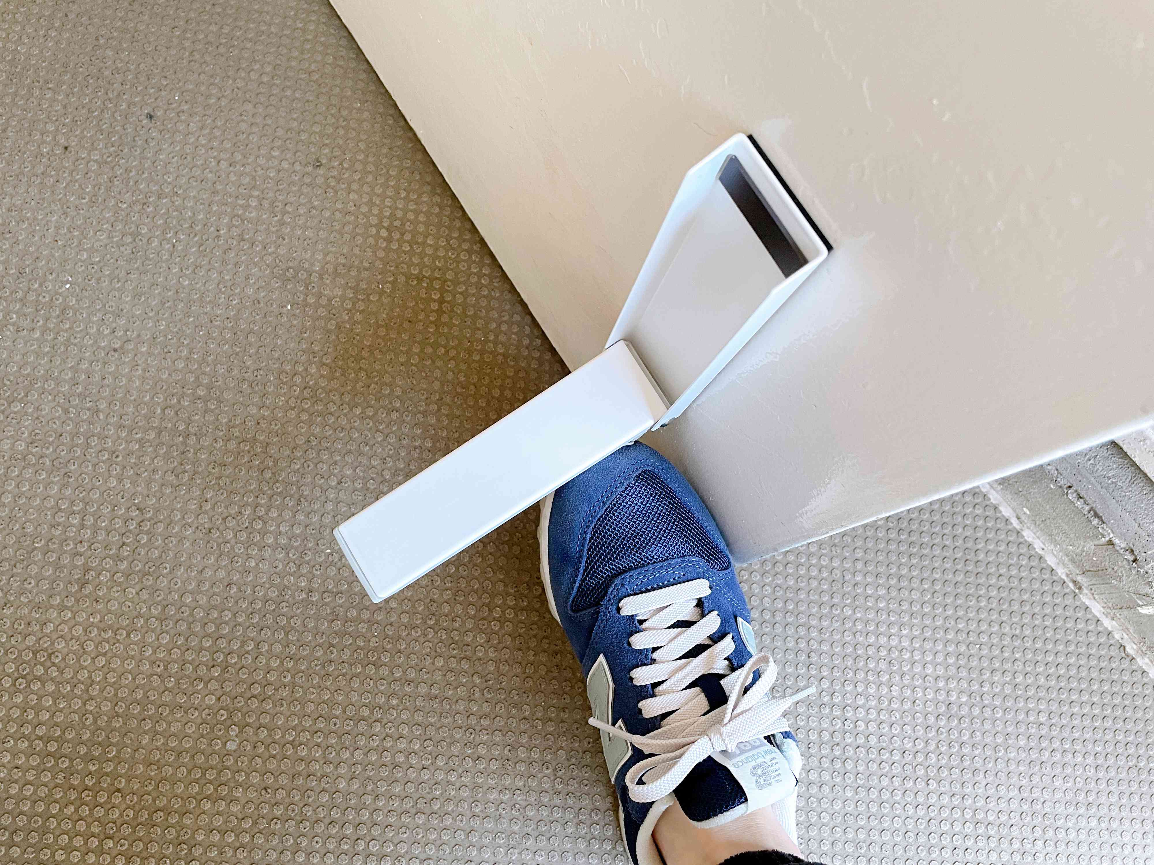 そのプレートを、片足で垂直に押し下げてドアを固定します。