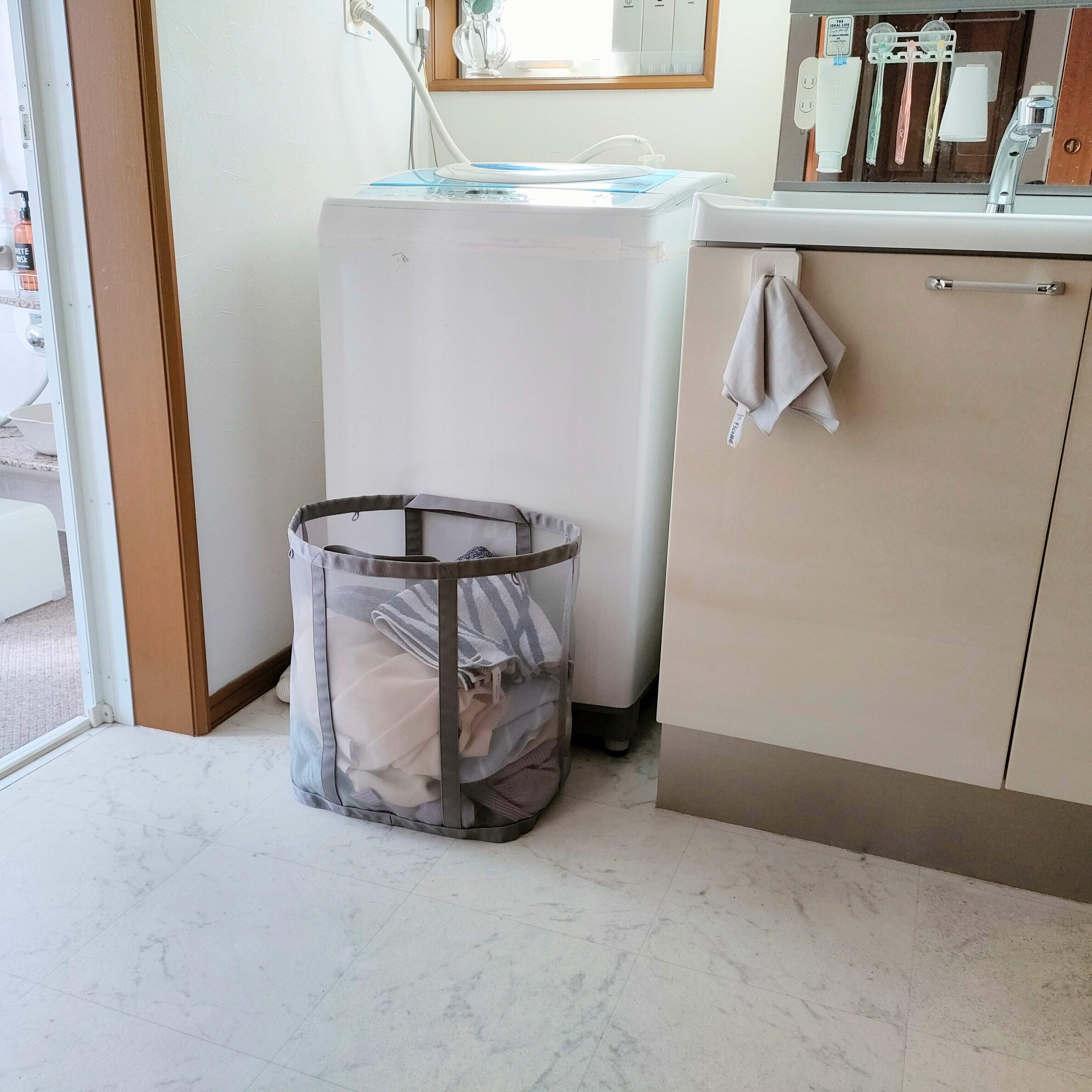 開口部が広いので洗濯物をポイッと入れやすく、たっぷり入る大容量サイズ。我が家は4人家族ですが、1日分の洗濯物を入れられるので助かっています。メッシュという素材上、中身がうっすら透けて見えますがそこまでごちゃつかず、適度にスッキリに見せてくれます。