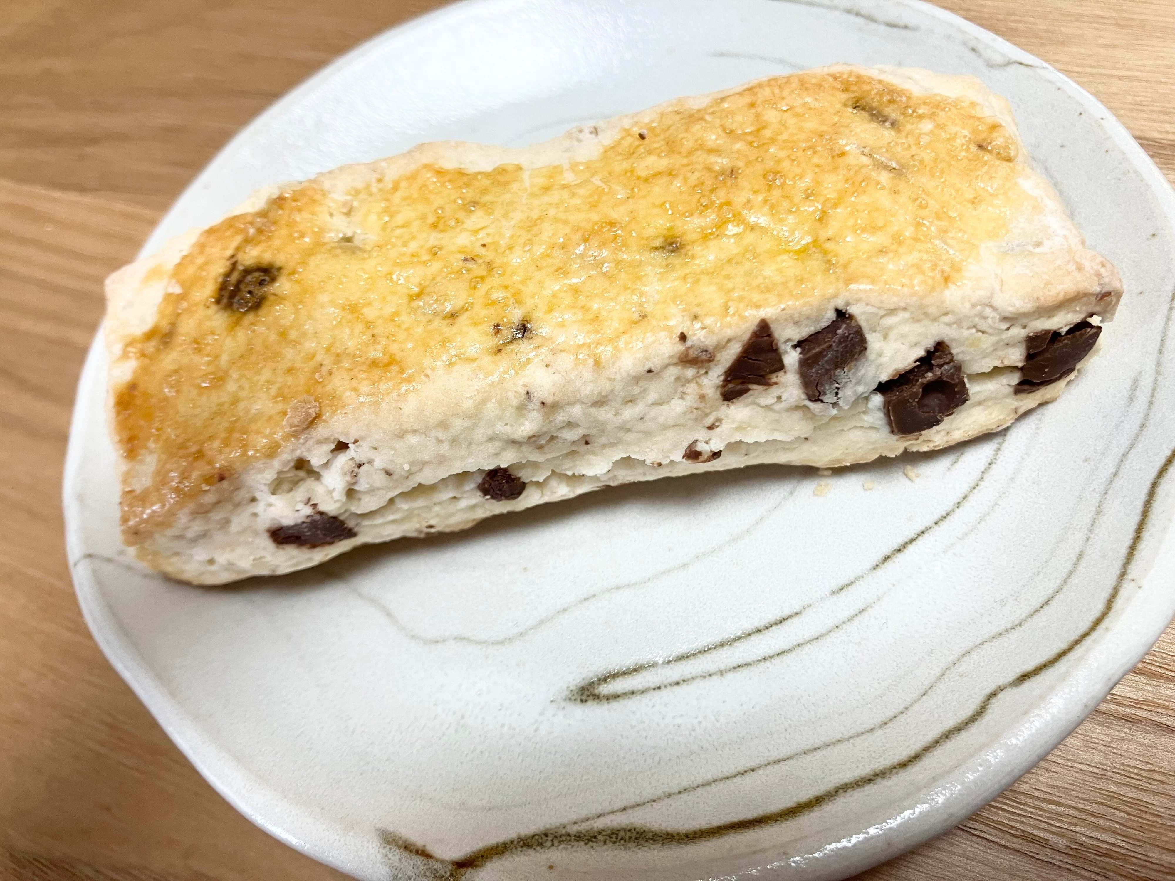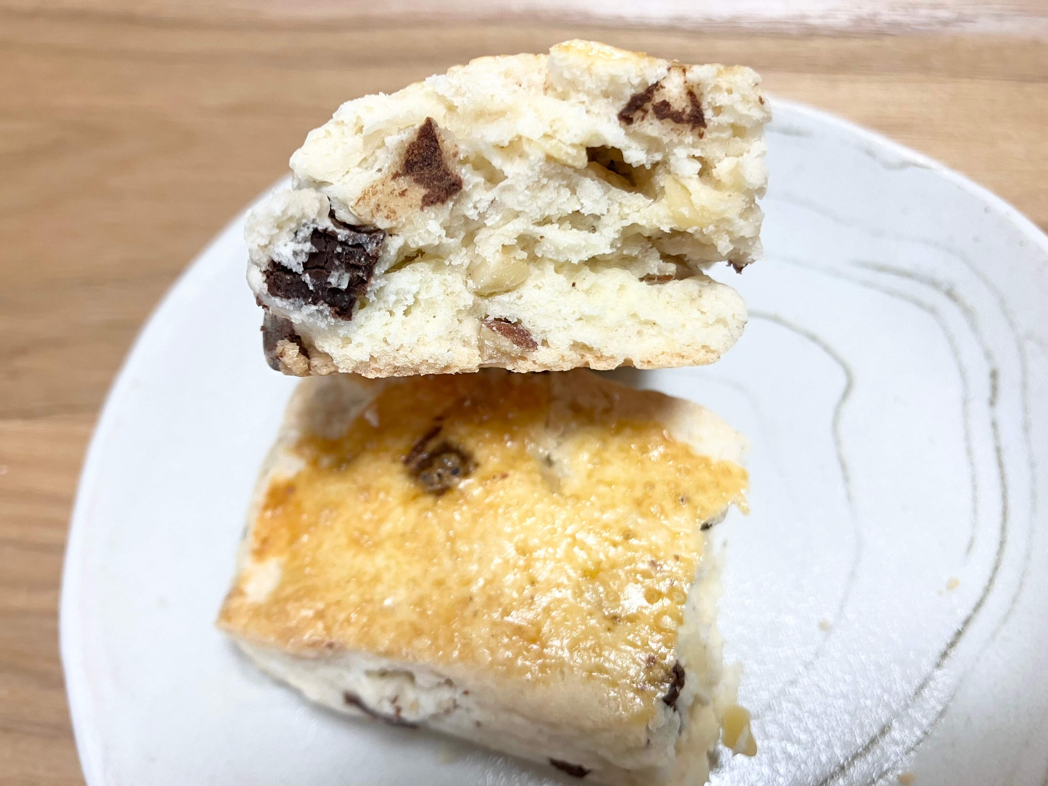 全体的にチョコが入っていることがわかります。一粒のチョコの大きさが、全部大きいという感じではないので、しっかりとした噛み応えはありません。それでも、アーモンドの味とチョコの味が良い感じに混ざり合っていておいしいです。はちみつのほうよりも、こちらのスコーンのほうが甘さを感じました。チョコチップスコーン好きとしては、もう少しチョコが大きいほうが嬉しいですが、満足できる味です。