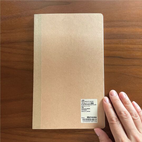 A5サイズの横幅が狭いスリムノート(290円)。買った当初は使いにくそうかもと不安でしたが、実際使ってみるとメモやアイデアを書き出すのにページの端が無駄に余らずちょうど良い大きさでした。スリムなためバッグに入れてもよれにくく、持ち運びやすくいのも好ポイント。上質紙なのでサラサラと書きやすくページも開きやすいのでストレスフリーのアイテムとして重宝しています。