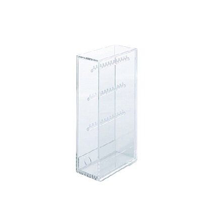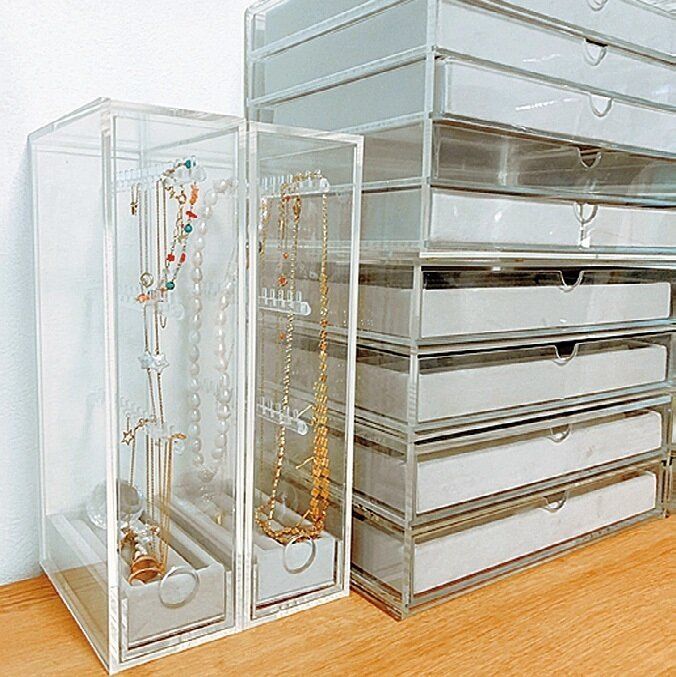 中身が見えるスタンド型と引き出し型のアクリルケース。「ごちゃごちゃしがちなネックレスやピアスなどを美しくシンプルに収納できます。ケースを重ねて使っています」。
