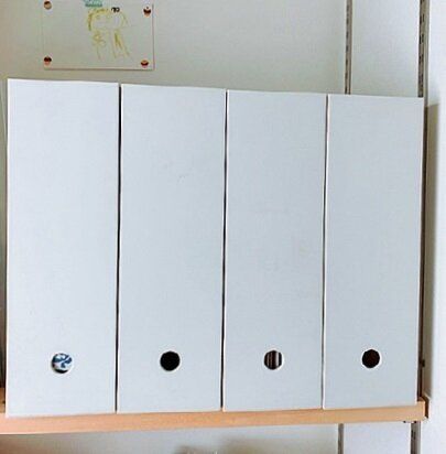 「学校、習い事、銀行、電気などジャンルに分けたラベルシールを貼ったうえで書類をしまっています。見た目もすっきり」。リビングなど人目につく場所でもこれなら大丈夫。