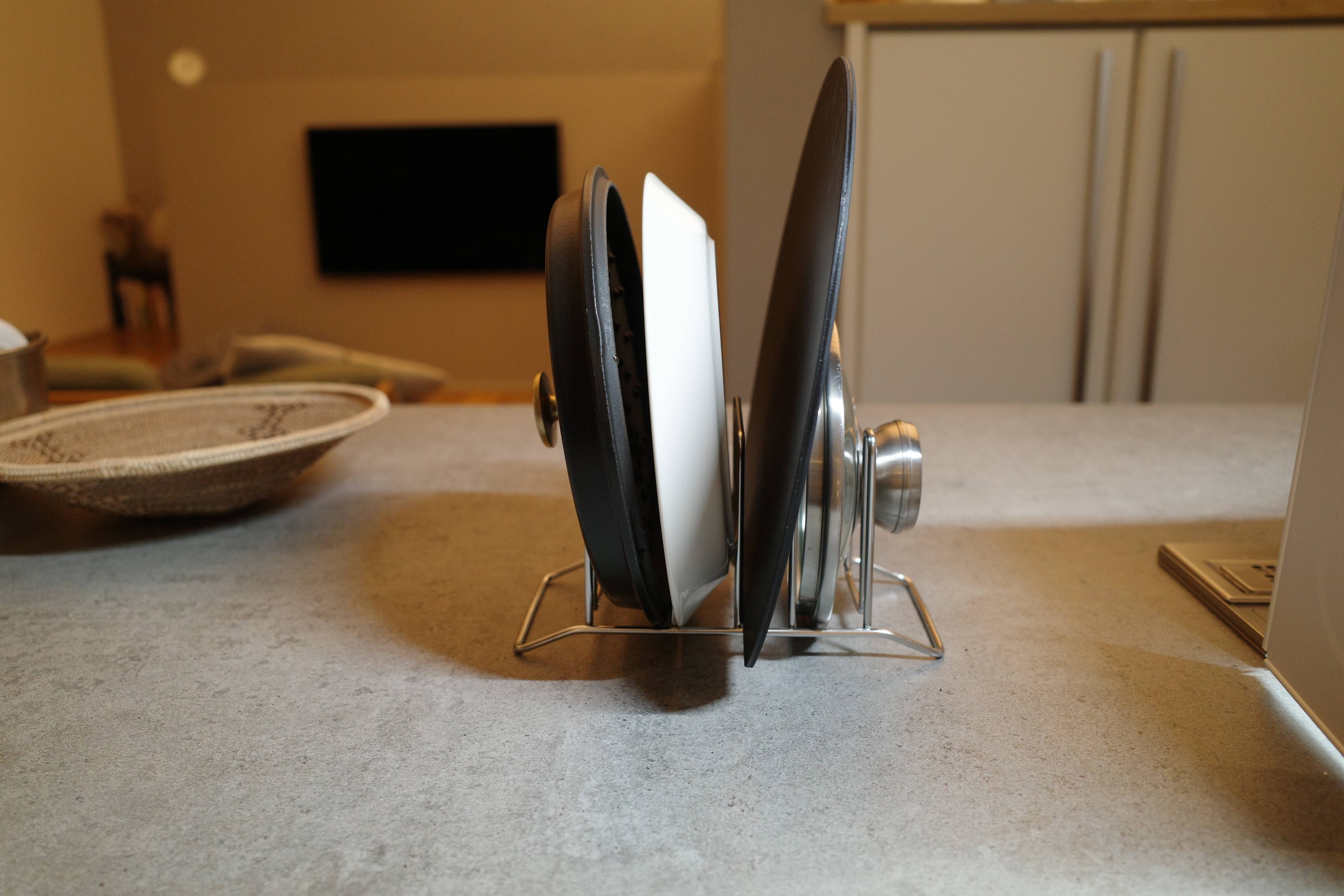 調理と洗浄が同時に進むキッチンに、「ステンレスキッチンスタンド」があるおかげで、「途中いったん鍋洗った鍋のふたを立てかけておく場所」ができます。しかも水切りしながら。限られたスペースのキッチンでは本当に助かります。