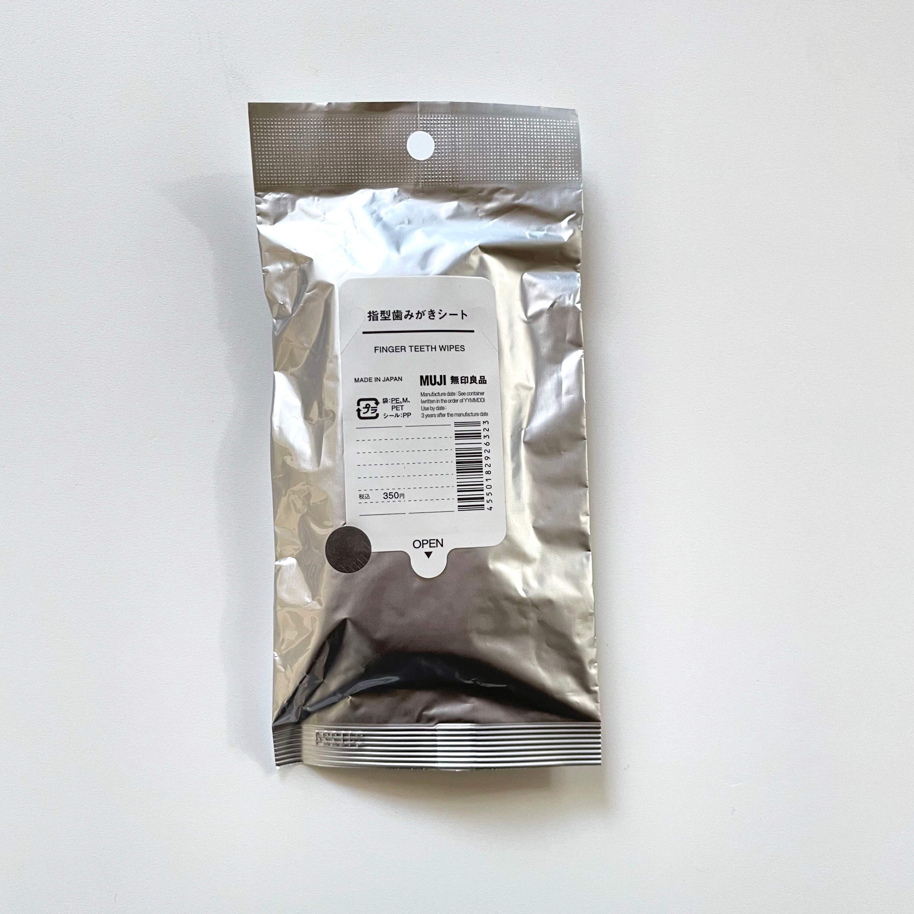 無印良品の「指型歯みがきシート」は、指に装着して歯磨きできる優れもの。手を汚さず歯の表面や口の中を拭けるため、手軽にいつでも口の中をリフレッシュできます。また、水で口をすすぐ必要がないので、水不足の場面では心強いアイテムです。