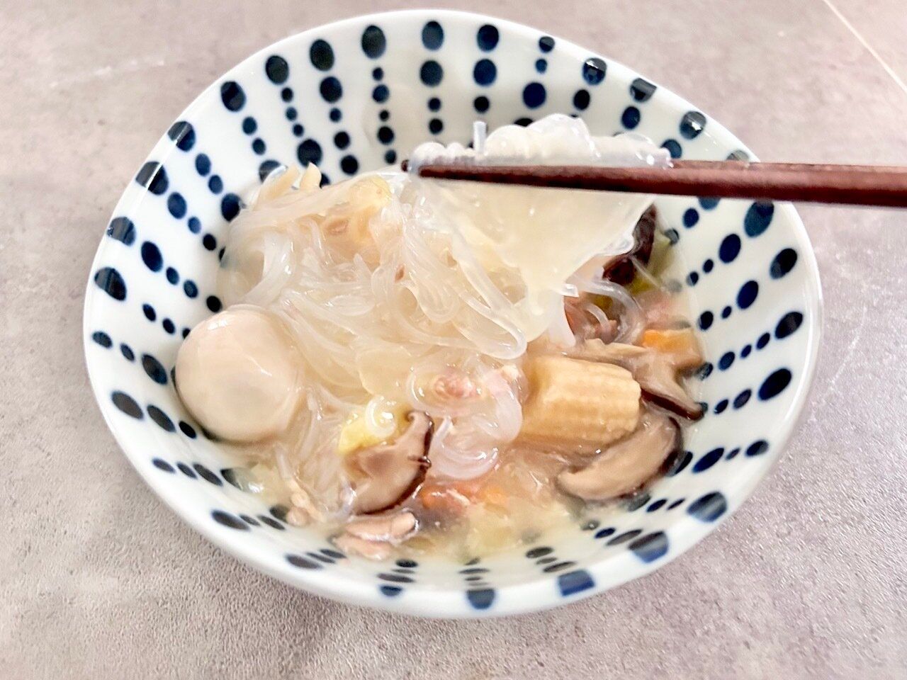 また、子どもの食事には、この八宝菜に具を追加して簡単おかずにアレンジ。春雨、白菜、豚バラなどを入れています。ご飯にかけても美味しいのですが、まだ小さい子どもたちは「普通の白いご飯が良かった!」となることもしばしば。ご飯にかけないほうが失敗しないので「おかず」として活用しています。