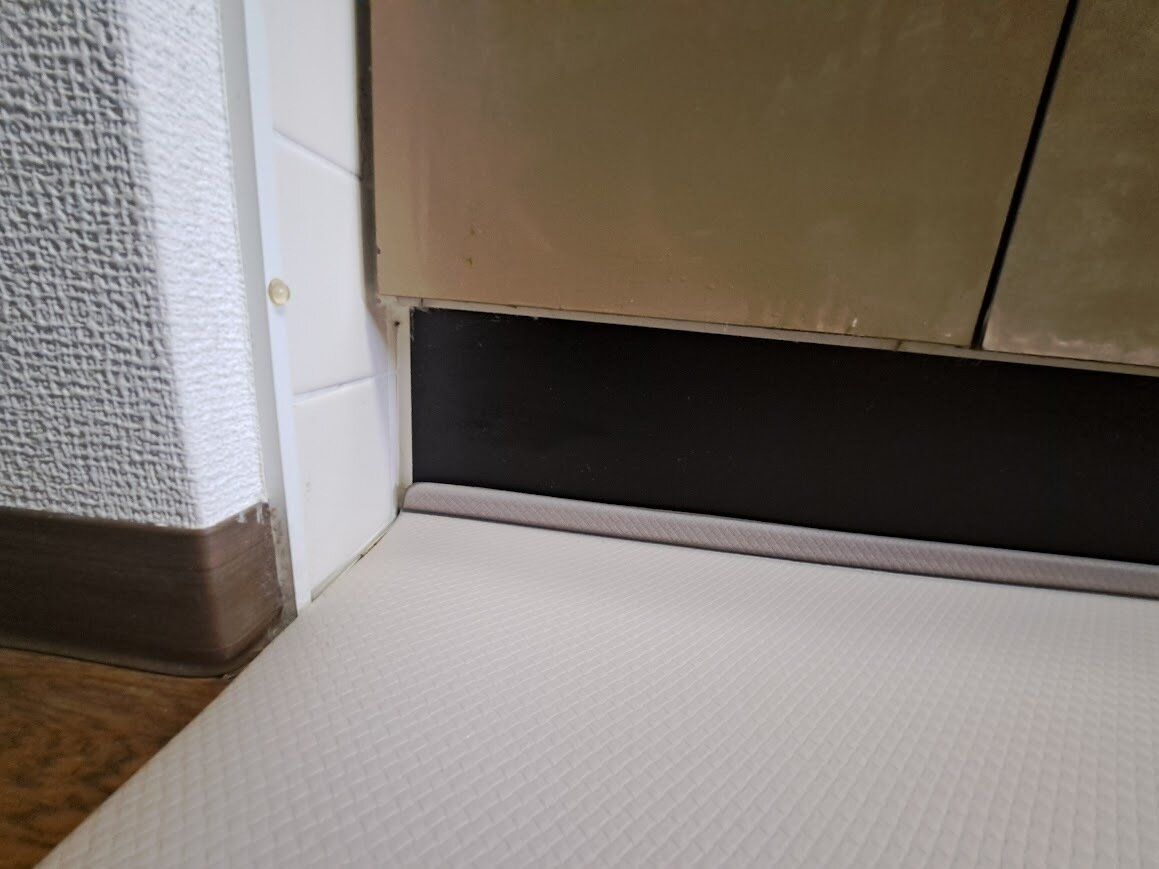 そのL字の折目が床とキッチン部分のすき間にぴったりフィットするため、ゴミがたまりにくい設計になっています。こんな商品いままで見たことなかったのですが、キッチンマット自体も、そうそう頻繁に買い替えるものでもないので、今はこんなことになっているのか!と驚きました。