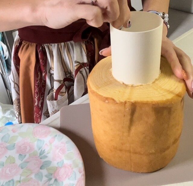 先ほどスライスした上の部分のバウムクーヘンを真ん中の穴の開いたところに合わせてカットし