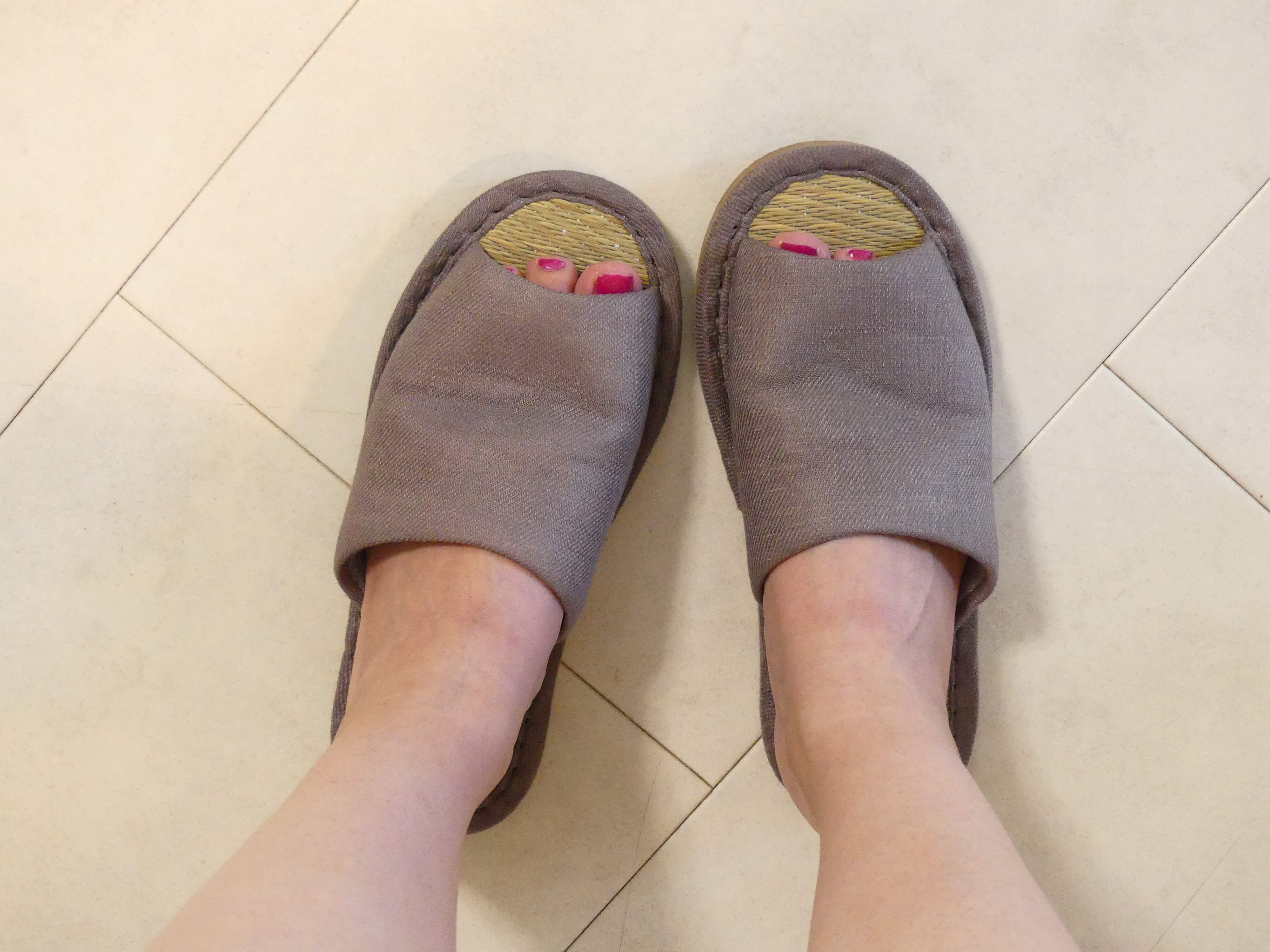 私のように裸足で履いてもOK、冷え対策で靴下を履いてからつかっても快適なイ草スリッパ。