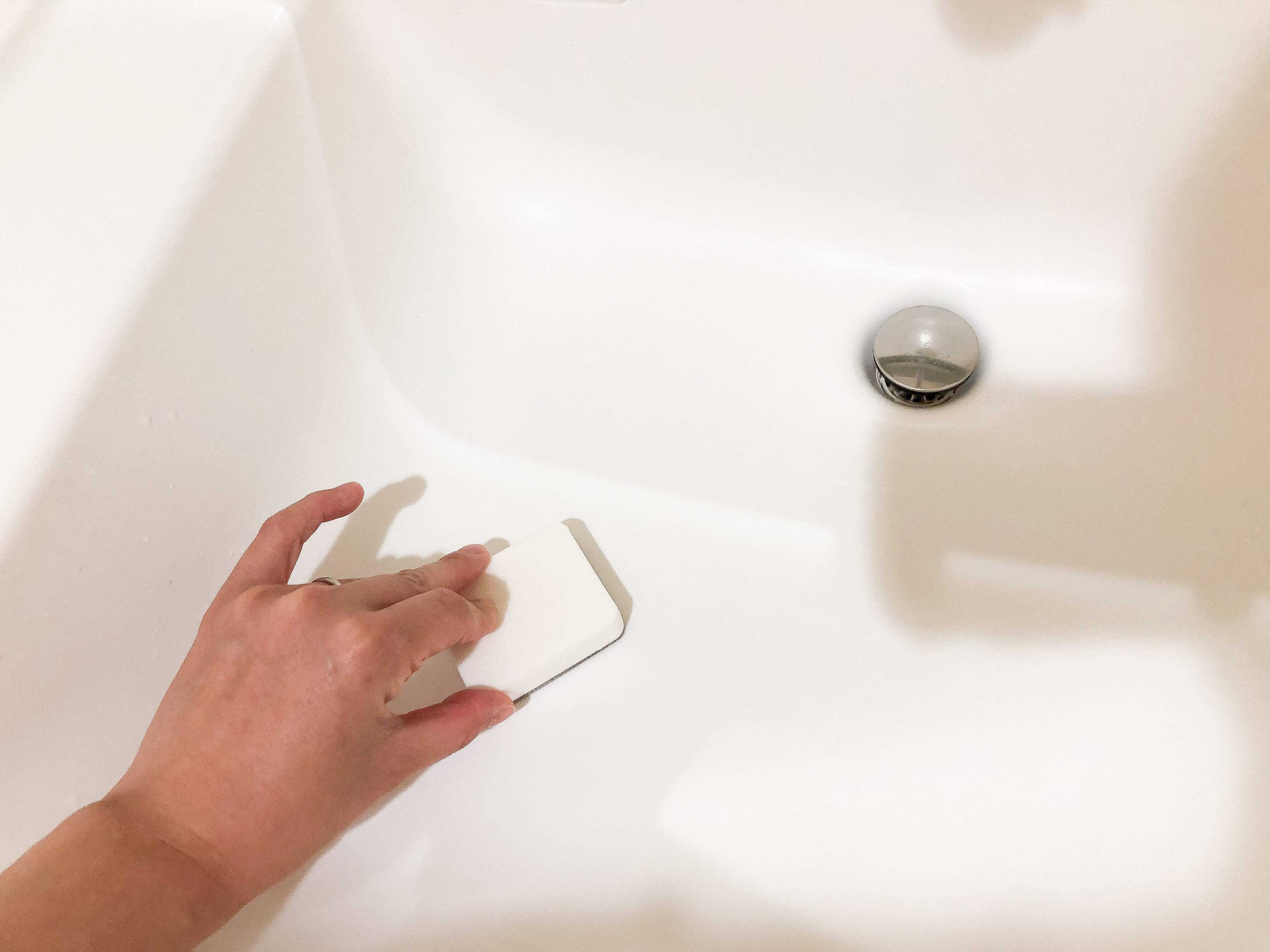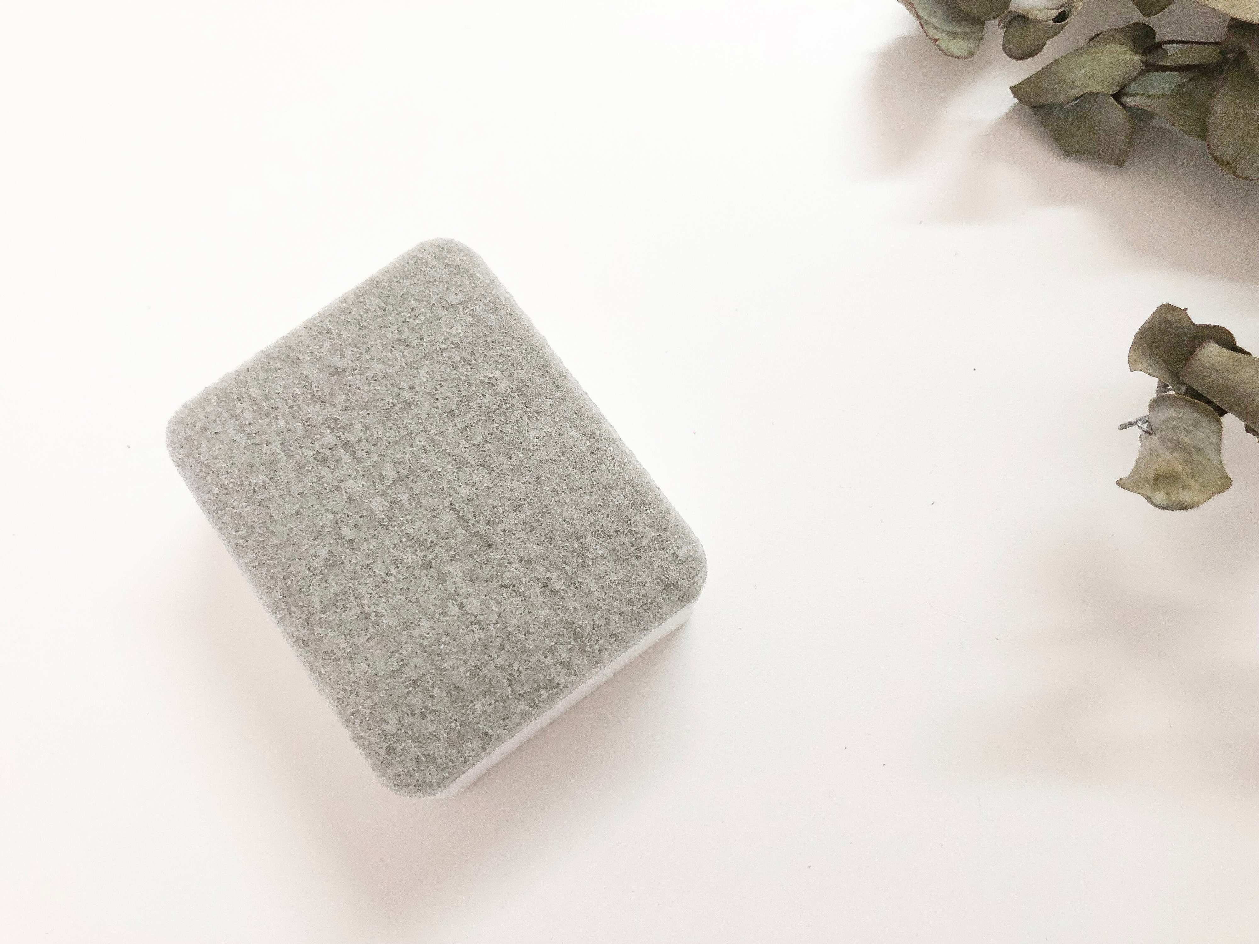 なのでグレーの面を下にして水で擦り洗いすることで、洗面ボウルにフッ素の膜をコーティングし、汚れをつきにくくするという仕組みだそうです。