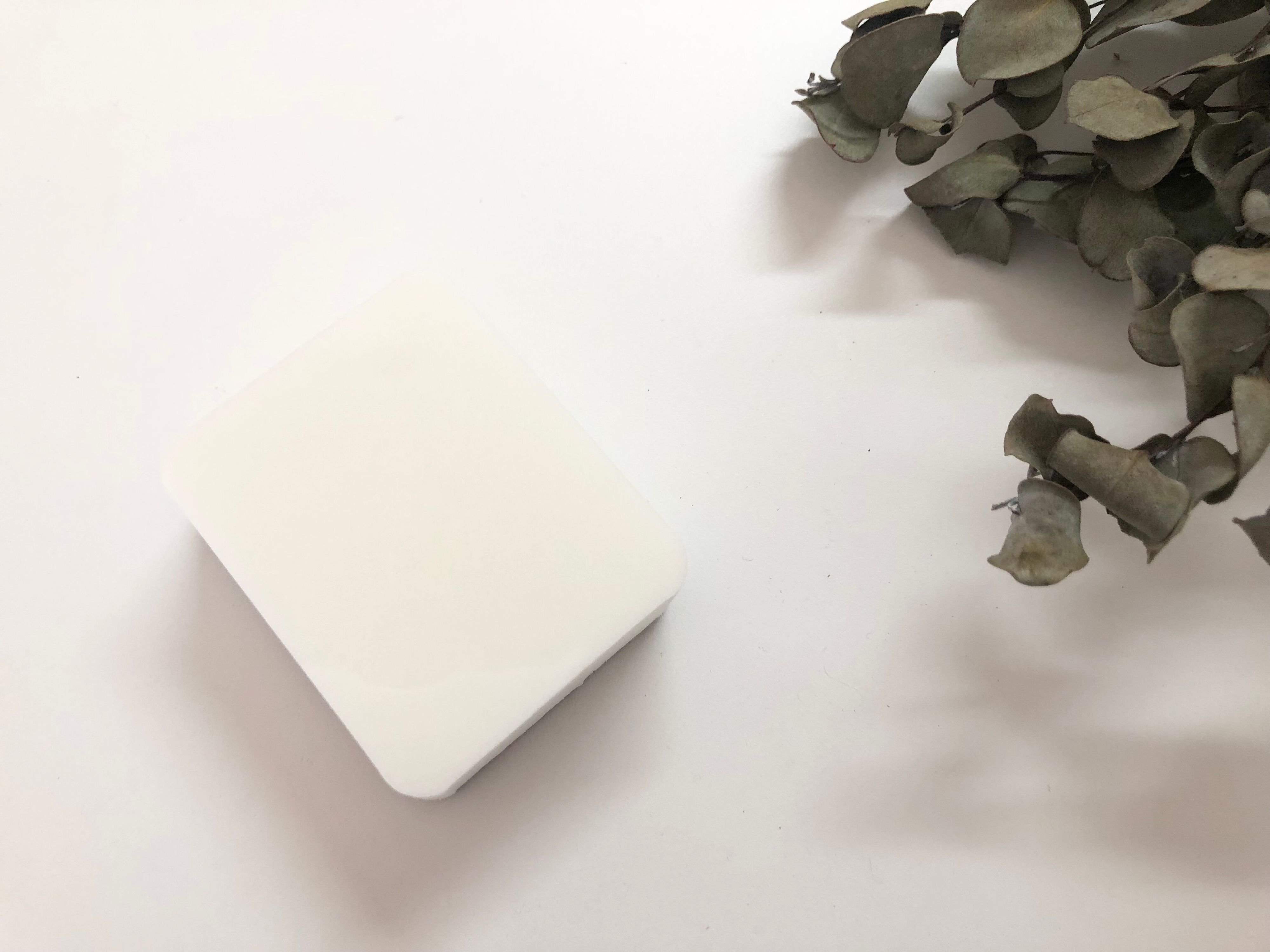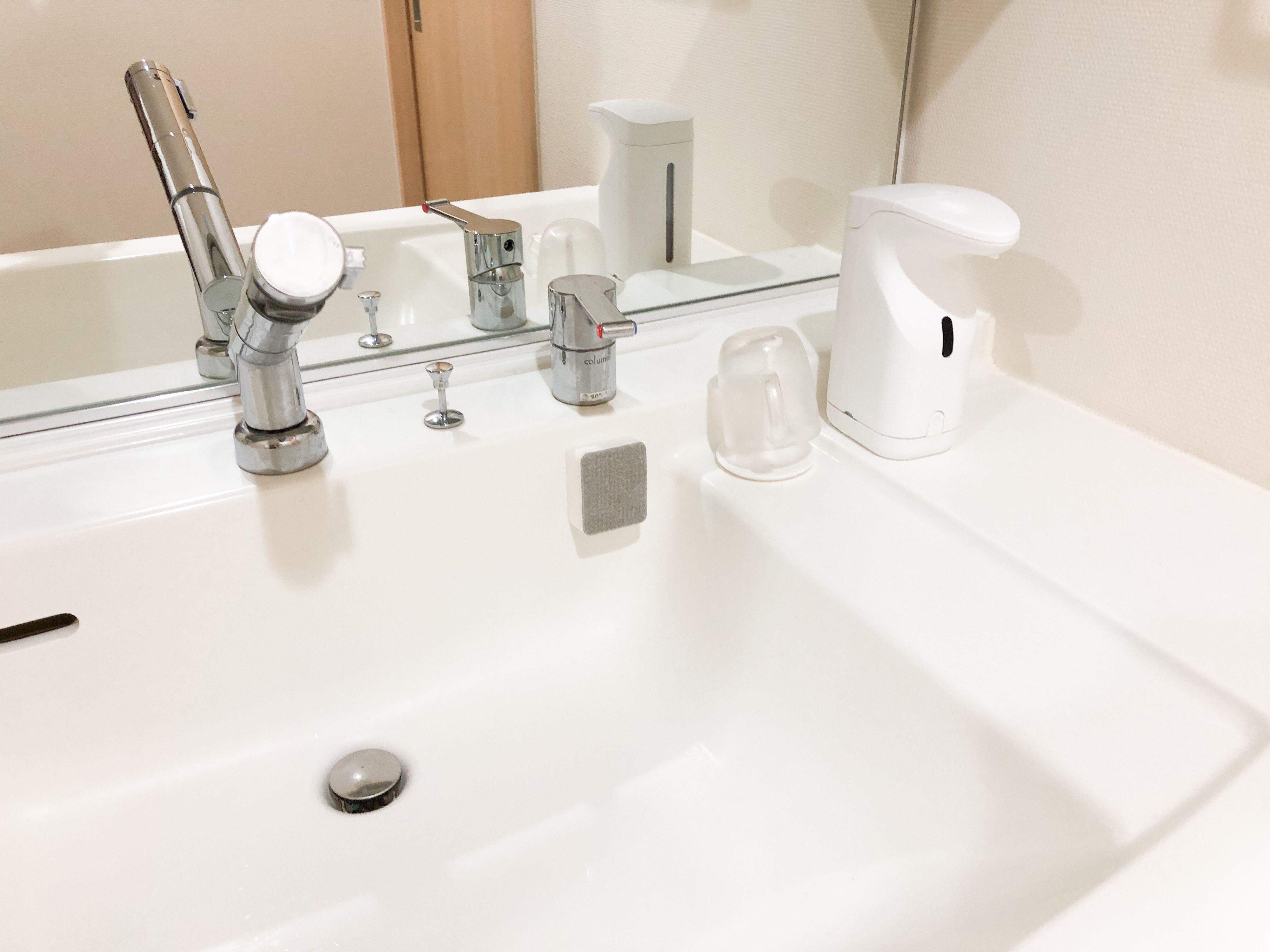スポンジの白い方は粘着面になっているので、洗面ボウルや鏡、壁などにペタッと貼り付けられるんです。