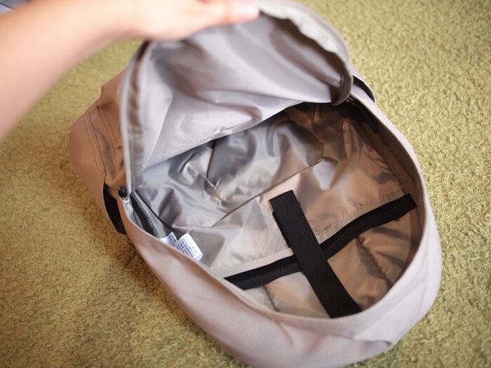 開け口が大きく開いて驚きました!ガバっと開きます。そしてPC収納ポケットがついています。細かい仕切りはないものの、ポーチや小さい肩掛けバックなどと併用すればさらに快適になりそうです!とにかく大容量。