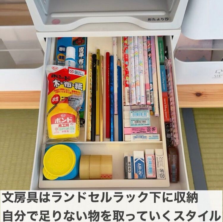 さらに細かい文房具類は「ポリプロピレンケース・引出式・横ワイド・浅型・ホワイトグレー」(1,390円)がおすすめ。中に仕切りのついたケースを入れればお子さんでもわかりやすくまとめることができます。