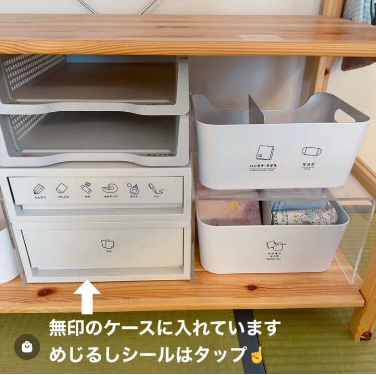 イラストつきのめじるしシールをつけておくと、どこに何が入っているのかすぐわかるので、迷子になることもなさそうです。文字だけでなく、イラストがあるのでお子さんでもパッとみてわかるのがいいですね。