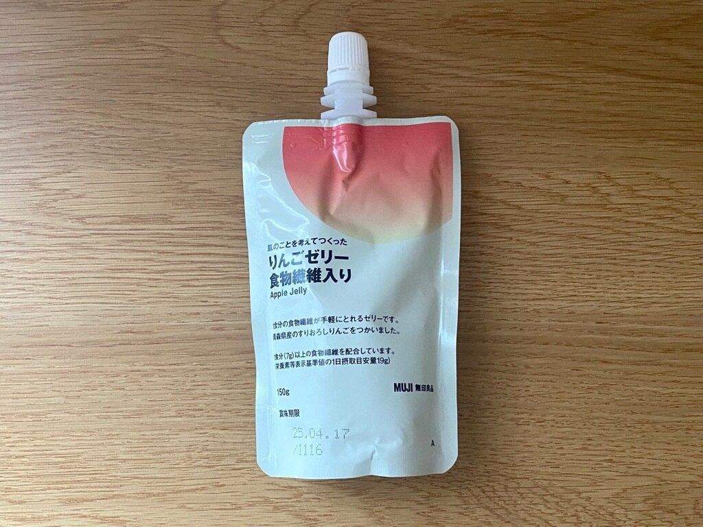 こちらも無印のお菓子コーナーで販売されている「肌のことを考えてつくった りんごゼリー 食物繊維入り」。青森県産のすりおろしりんごを使用してつくったゼリードリンクです。1食分の目安量7gの食物繊維を配合しており、おいしく気軽に摂取することができます。