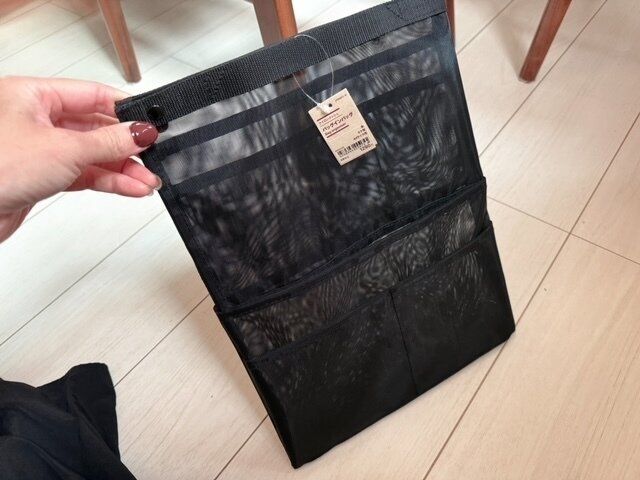 スッキリ収納できただけでも十分うれしいのに、こちらはなんと“手持ちつき”。メッシュバッグの上部に小さな持ち手がついているので、そのままサッと持ち運べます。ふだんはバッグに入れて使っていますが、必要なときだけこれだけ持ち歩くことも可能。まさに「こういうの欲しかった!」と思える便利な機能でした。