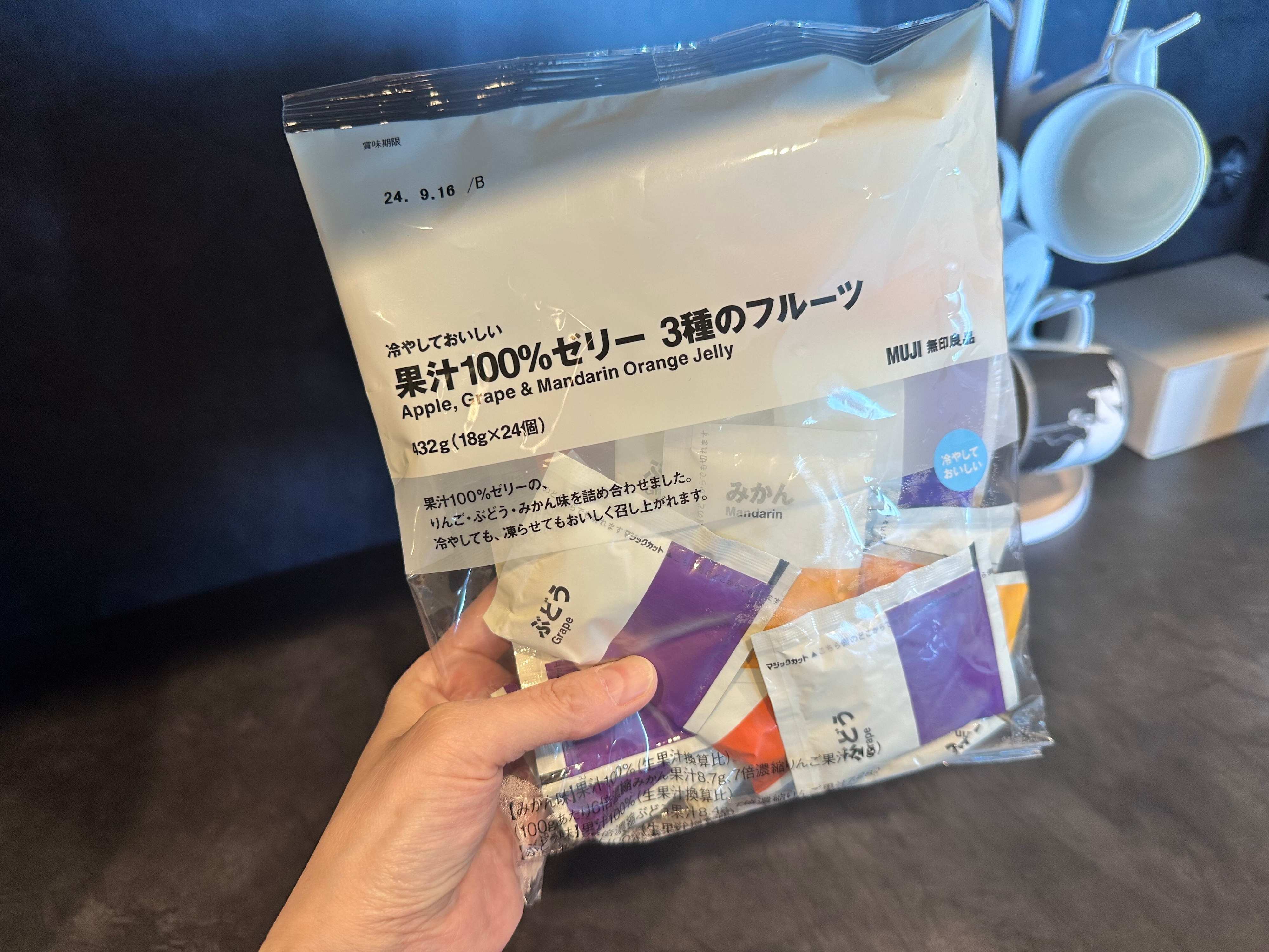 無印良品の『冷やしておいしい果汁100%ゼリー3種のフルーツ』。18g 24個入りで、価格は490円です。