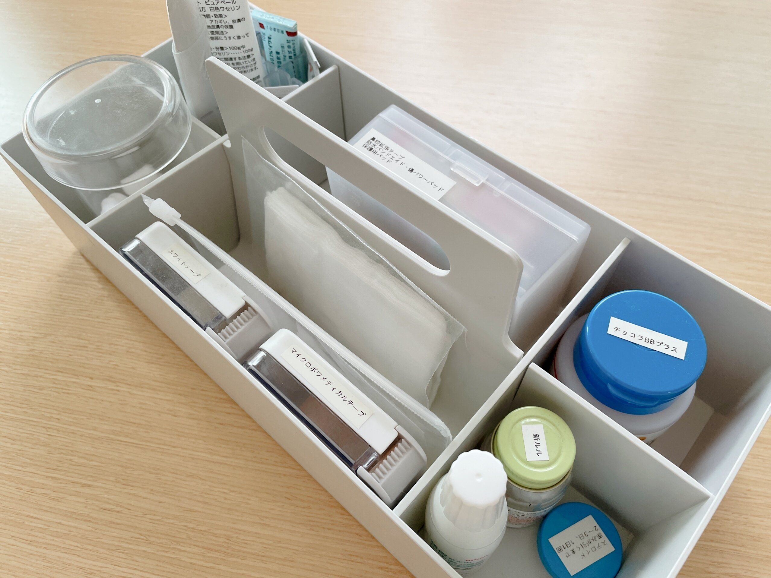 1つ目は救急ボックスとして使っています。救急ボックスは家族が必要なときにすぐに必要なものを取り出せるのが必須条件。子どもたちでもすぐに手に取れるようにと選んだのがキャリーボックス。軽いので子どもでも持ち運ぶのが楽ちん。またフタがないので必要なものだけをすぐに手に取れるのがよい点です。