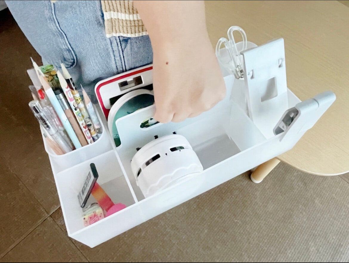 3つ目は文具品ボックスとして使っています。消しゴムカスが机に残るのを防止するため、文具品と卓上クリーナーを一緒にセットしたいということで、キャリーボックスを使い始めました。他にもペンや定規、電卓などもセットしているので、机の上に置き忘れがなくなって子どもたちの片づけもスムーズです。