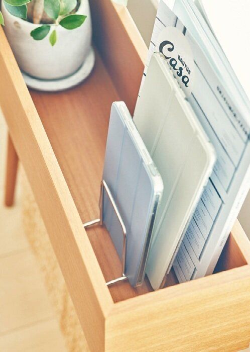 プランターボックスにスタンドを入れ、雑誌やiPadを立てて収納。ワンアクションで取り出せ、戻すのもラクだから出しっぱなし知らずです。まな板スタンドの名前に縛られず、柔軟に使い回します。
