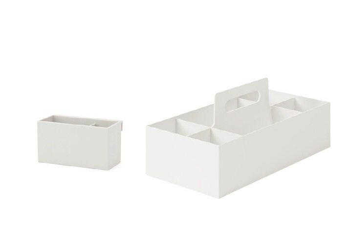 「ポリプロピレン収納キャリーボックス・ワイド・ホワイトグレー」(約横15×奥行き32×高さ8cm)¥990、「ポリプロピレンファイルボックス用・仕切付ポケット」(約幅90×奥行き40×高さ50mm)¥150