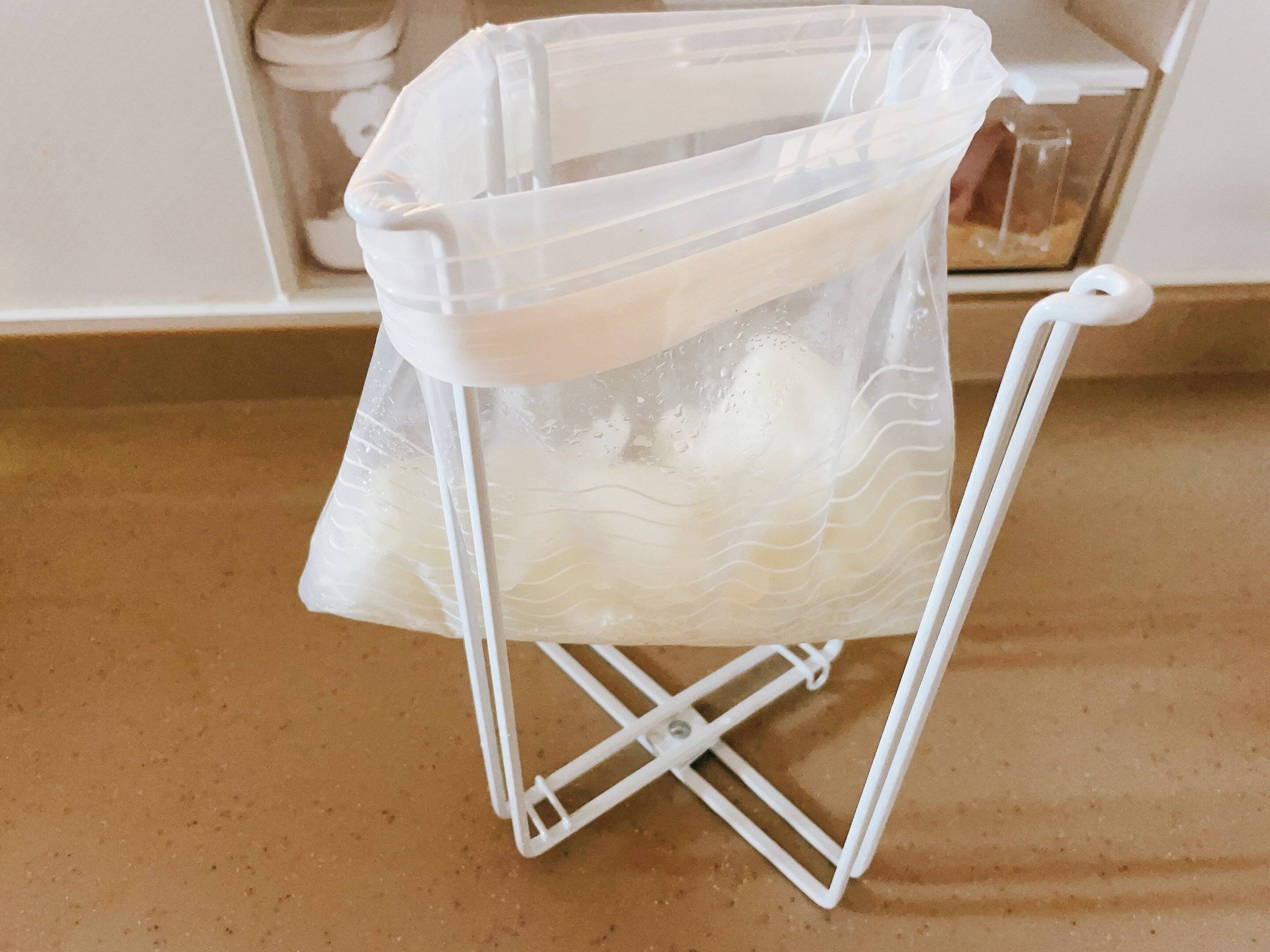 お肉や野菜を冷凍保存するときも、このスキットエコスタンドに保存袋を掛けて口を広げると、カットした材料が入れやすくなります。
