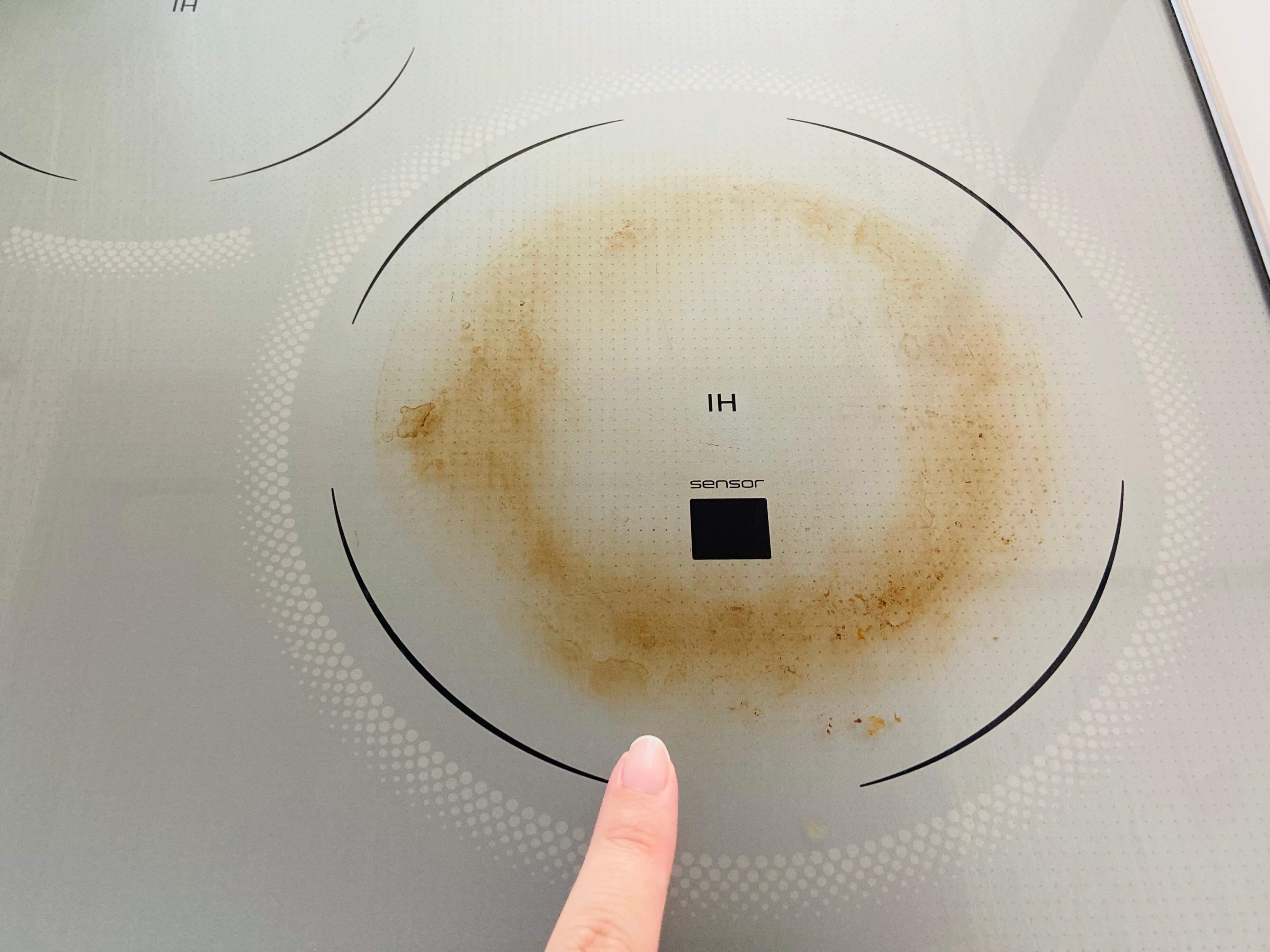 さっと水拭きはするものの、めんどくさくて放置してしまった焦げ付き汚れです。放置しすぎると本当に落ちづらくなるんですよね。今回はこちらに試してみます。