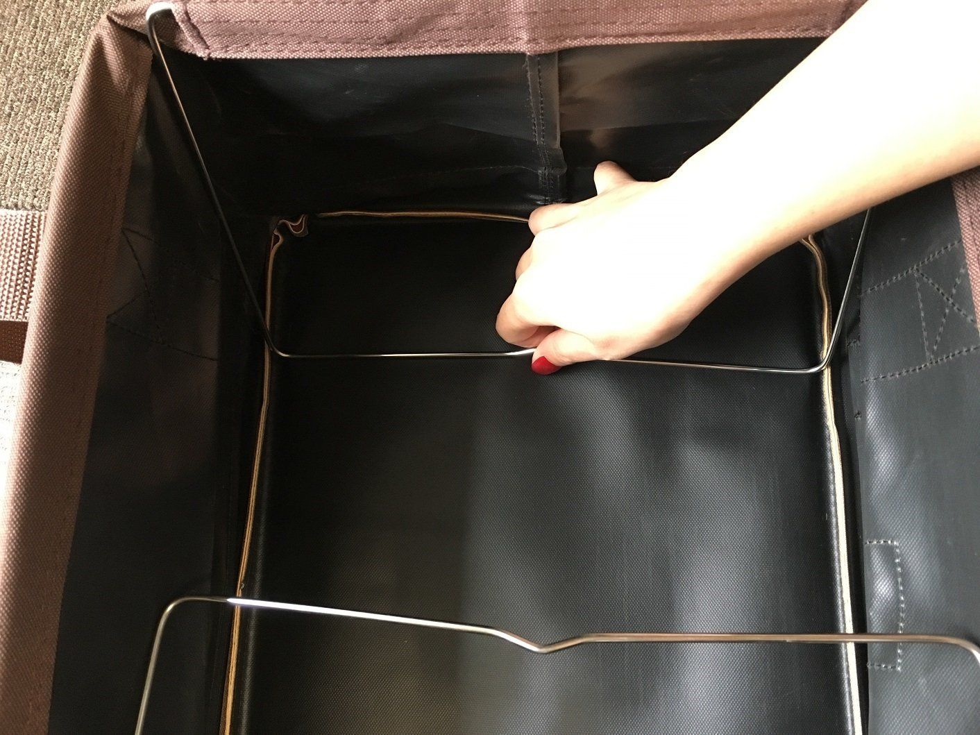 平たく畳んだ状態で販売されていますが、使うときには縦に広げてからスチールの部分を下に下ろしてとめるだけ。これで枠組みがしっかりするので、ある程度重い荷物も安心。なんと15kgの耐荷重です。