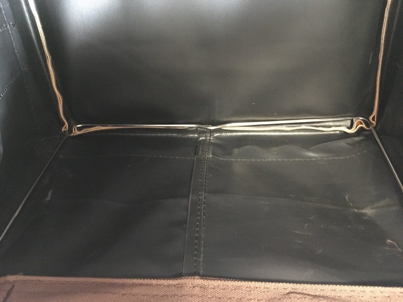 全体のカラーはブラウンですが、取手と底部分はキャメル色の合皮になっていて、見た目もオシャレ。高さがあまりないので、入れた中身が見えやすいのも使いやすいですね。