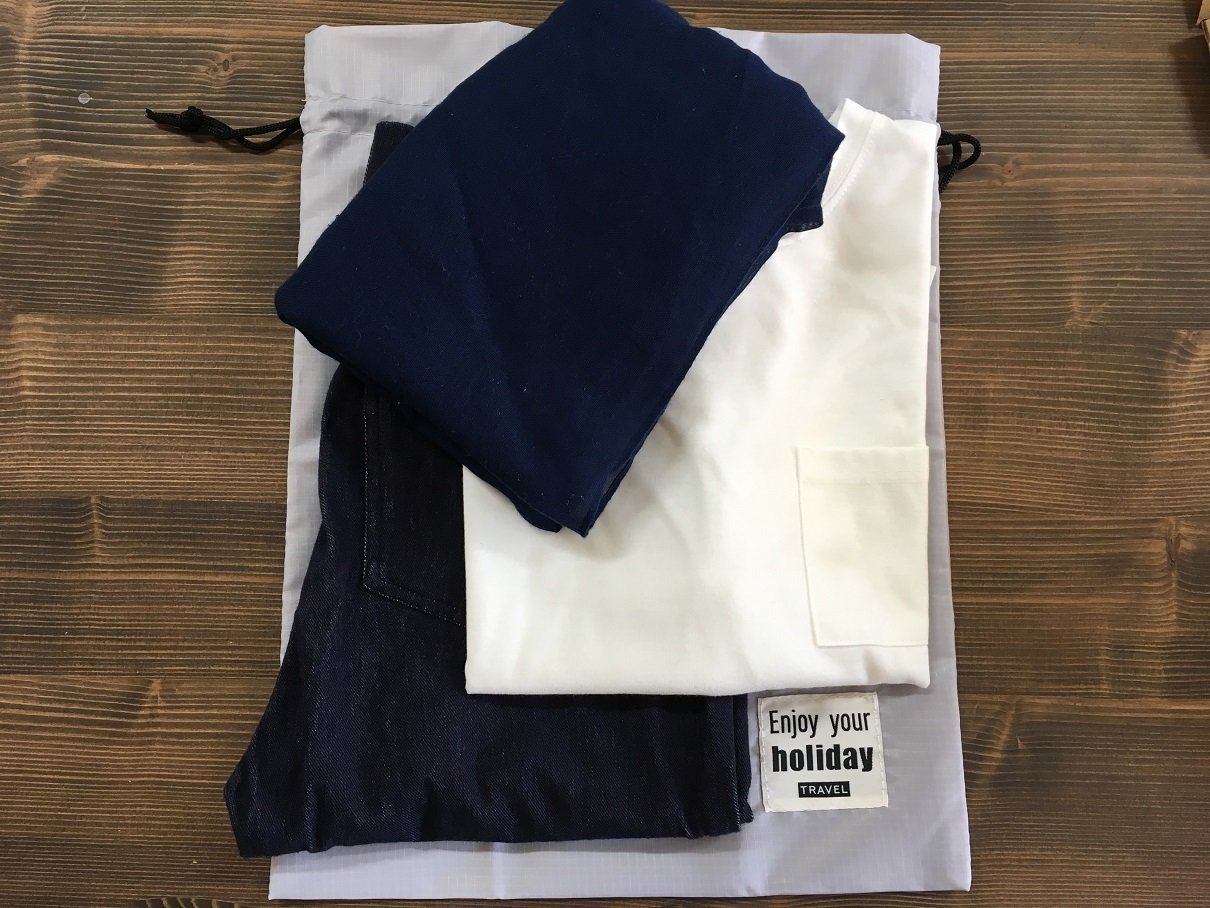次はMサイズ、Sよりも縦幅が10cm長い44×34cm。Tシャツ、デニム、ストールを1枚ずつ入れてみましたが、写真のようにまだ入りそう。ここにインナー、靴下とハンカチと1日分の着替えを入れることも可能です。